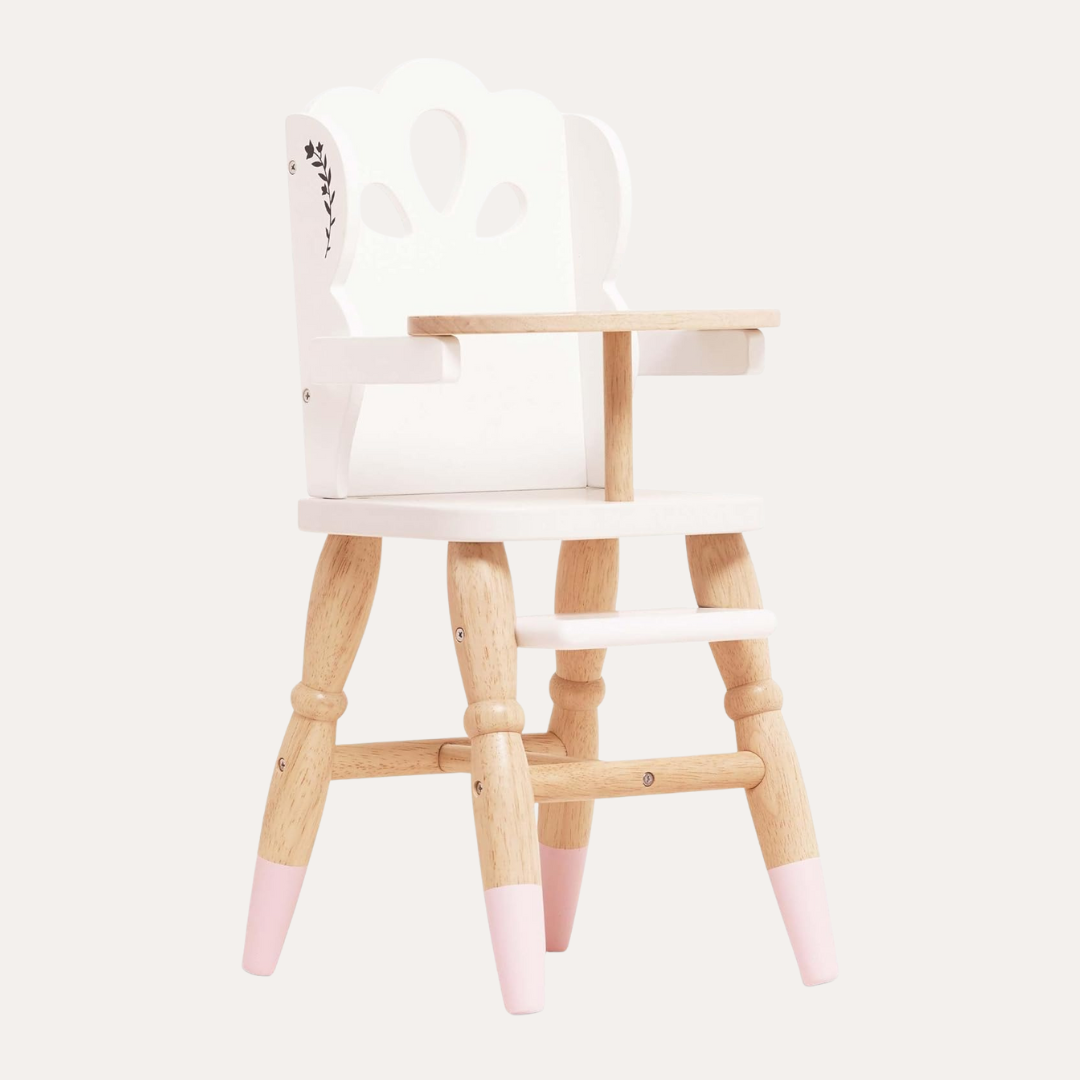 This adorable wooden high chair is perfect for your little one’s doll play adventures. Sized just right for dolls and soft toys about 30-35cm (12-14in), it sparks endless imaginative fun as young mums and dads care for their toy friends. Made from eco-friendly FSC®-certified wood with charming details like spindled legs, floral cut-outs, a tray table, and footrest, this plastic-free chair brings classic role play to life in the sweetest way.
