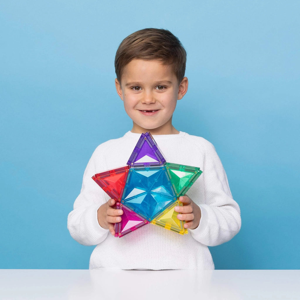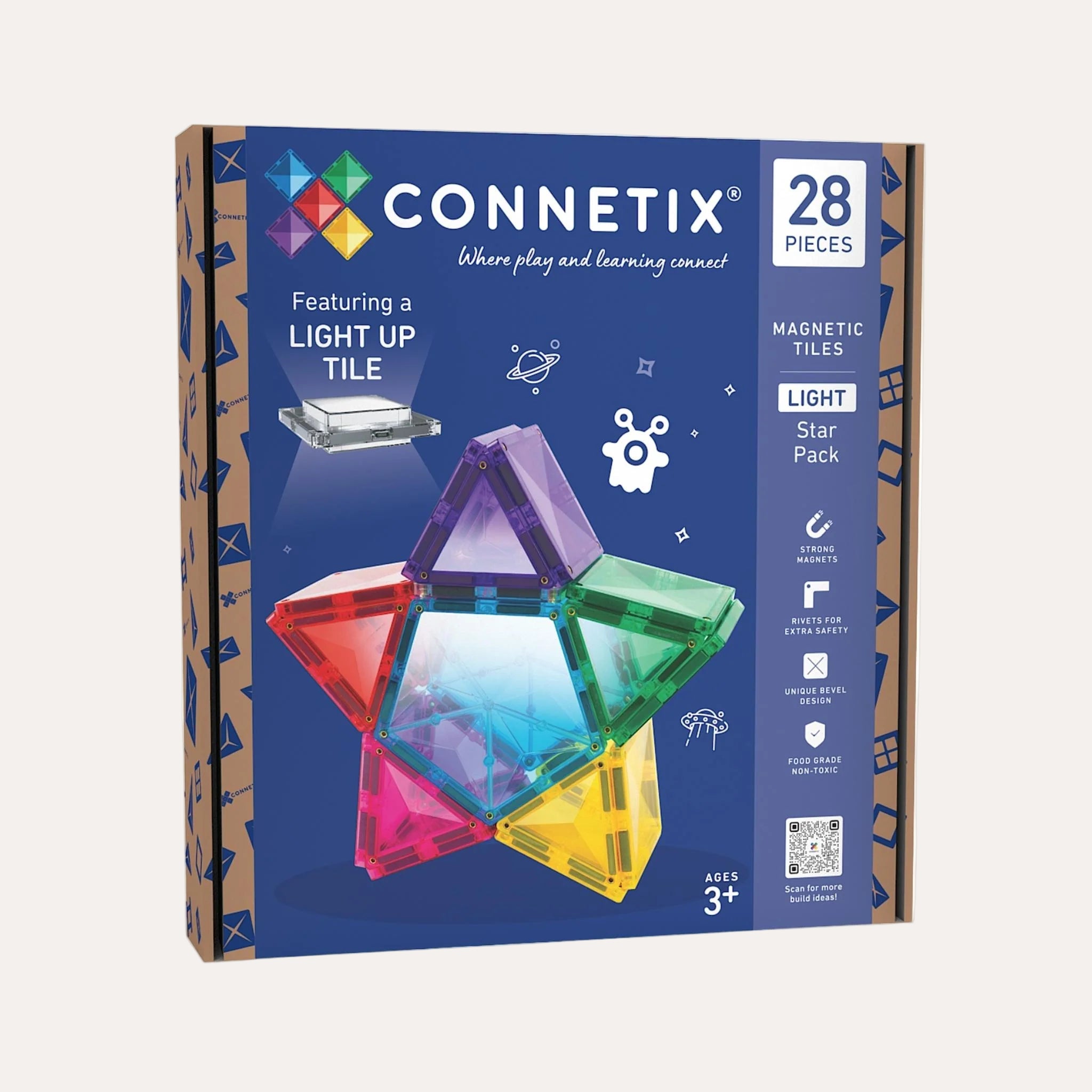 Let creativity sparkle with the Connetix Tiles - 28 Piece Light Star Pack. This vibrant magnetic set features colourful tiles in red, pink, yellow, green, orange, and purple, plus a rechargeable light-up tile that brings builds to glowing life. With pentagons, squares, and equilateral triangles, kids can craft stars, houses, or whatever their imagination dreams up. The magical light tile sparks learning through colour mixing, refractions, and shadow play. Safe, sturdy, and easy to connect, these tiles are thoughtfully designed for little hands to explore, build, and shine.