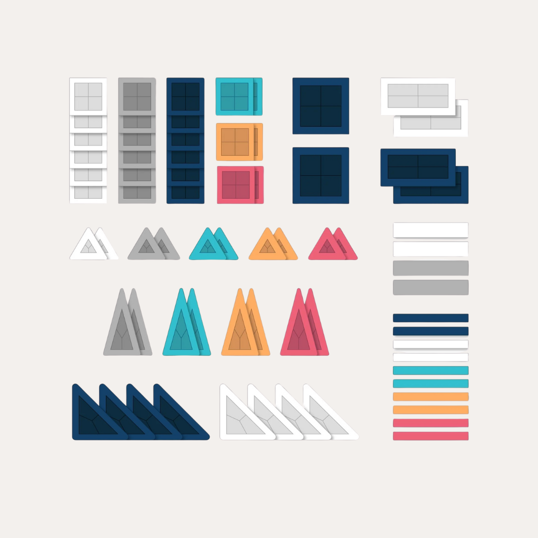 Six contemporary colours across squares, rectangles, three triangle varieties, posts, and planks inspire complex structures and imaginative problem-solving.