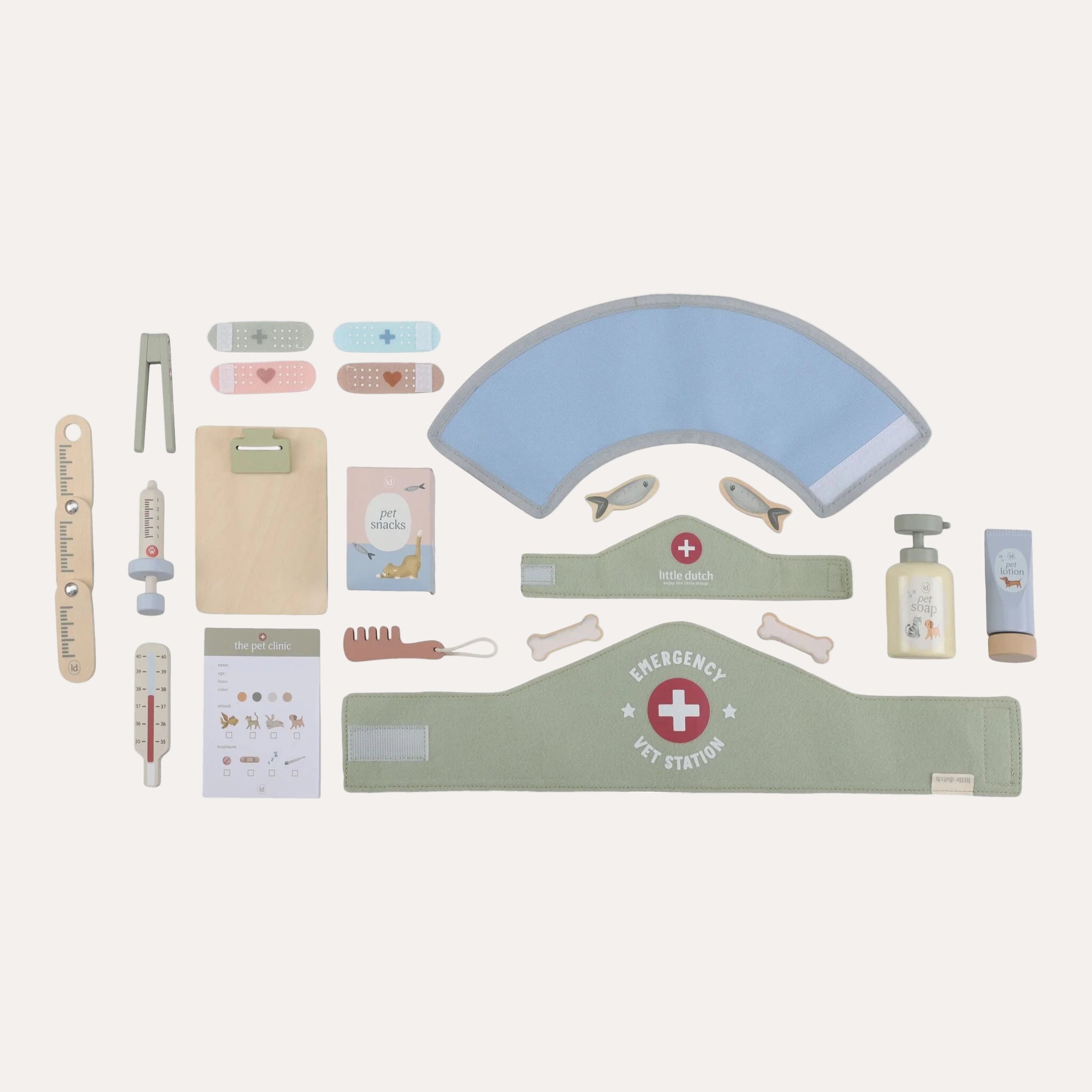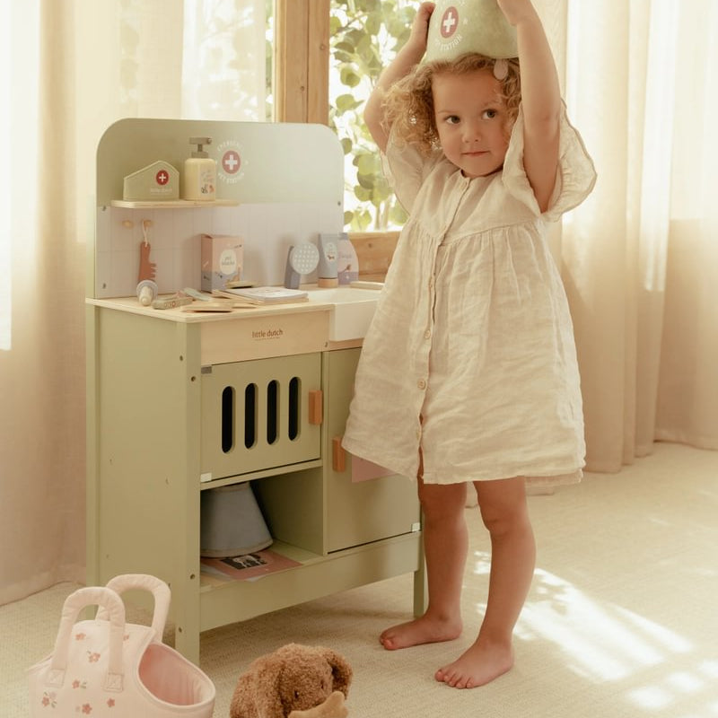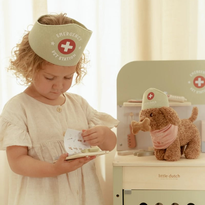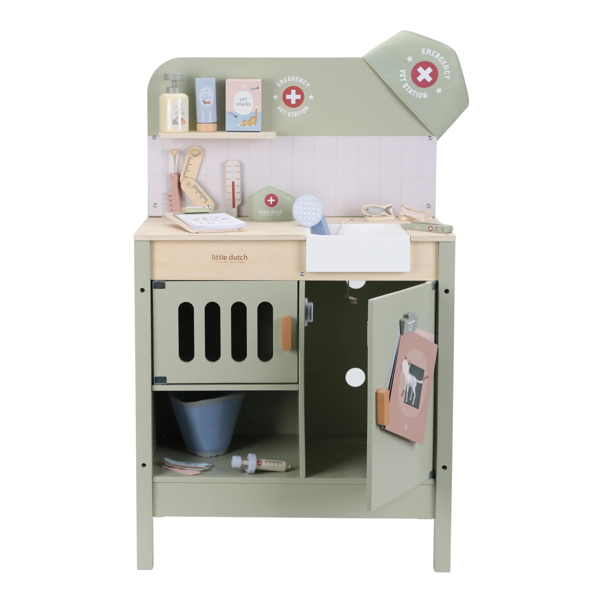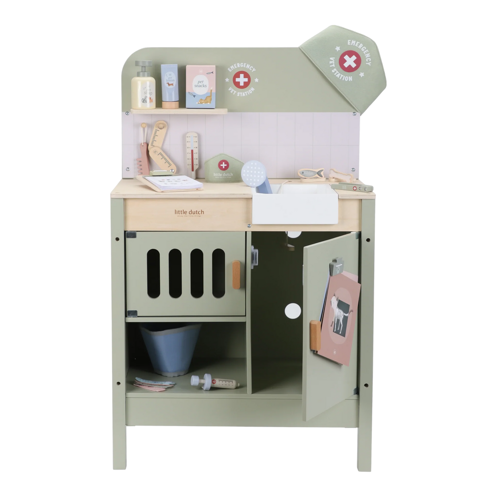 Step into the world of caring for sick stuffed animals with this Wooden Veterinary Practice FSC. Designed for endless imaginative play, it features a sink with a retractable shower head, comb, thermometer, syringe, bandages, and more. Your little vet can even display medical illustrations and X-rays using the fabric headband and special clip. Perfect for nurturing skills and fun role-play, this set invites your child to care for every furry patient that comes through the door!