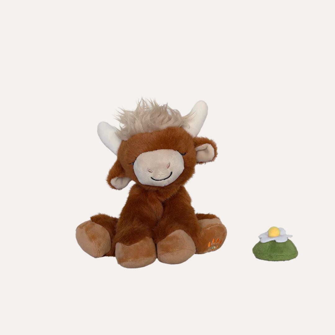 Meet Gus, a charmingly clumsy Highland Cow with a heart of gold. This lovable character is always discovering something wonderful, whether he's lost it first or not. Gus moves through the world thoughtfully—chewing slowly, pondering life's mysteries, and delivering the coziest side-hugs around. Equipped with a magnetic mouth to cradle his included flower pacifier, plus a hidden neck magnet for gentle carrying by magnetic pals, Gus transforms playtime into moments of imaginative wonder and tender connection.