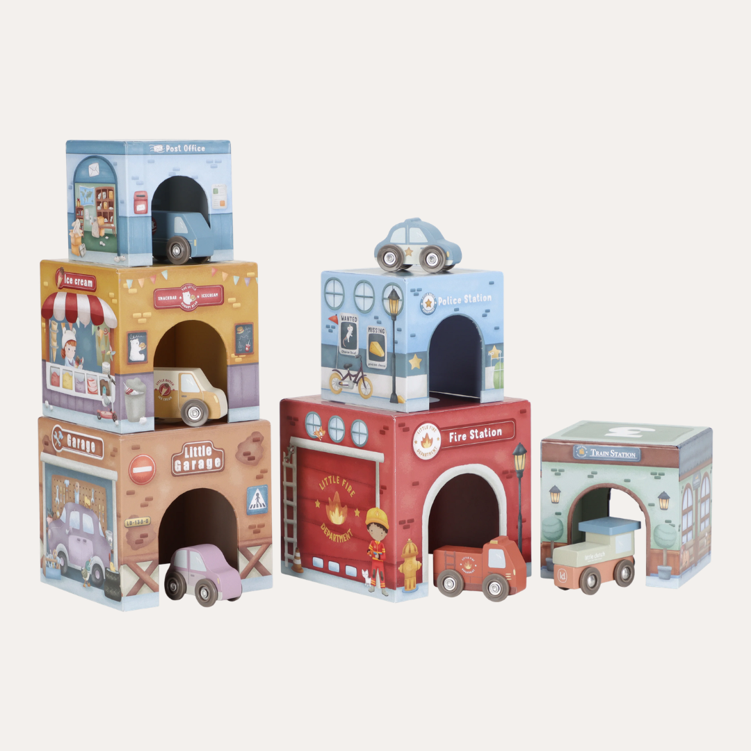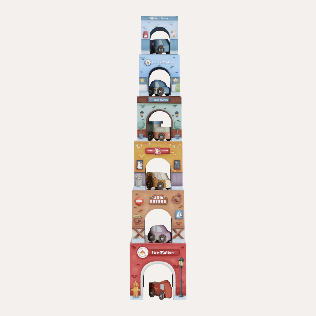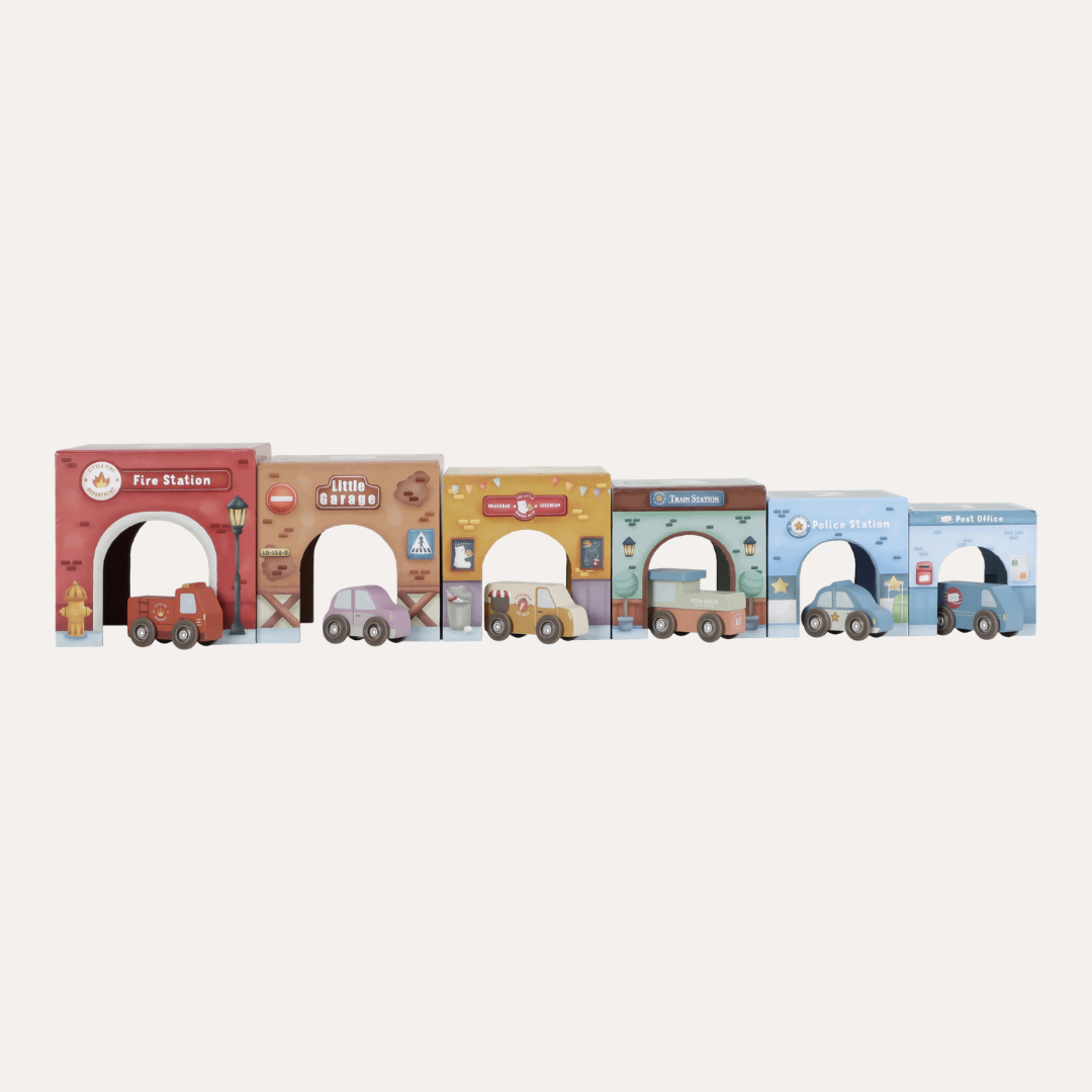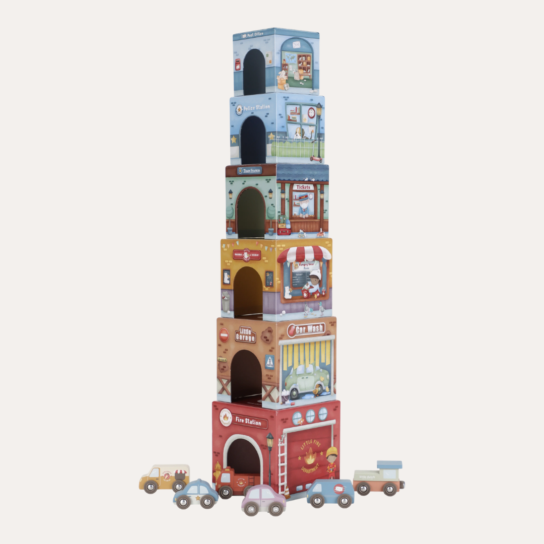 Stack them skyward, arrange them as a track, or integrate them seamlessly with the Little Dutch Train Track XL - watch as vehicles glide effortlessly beneath. Designed to nurture fine motor skills and creative thinking, these blocks transform simple stacking into storytelling, one layer at a time.