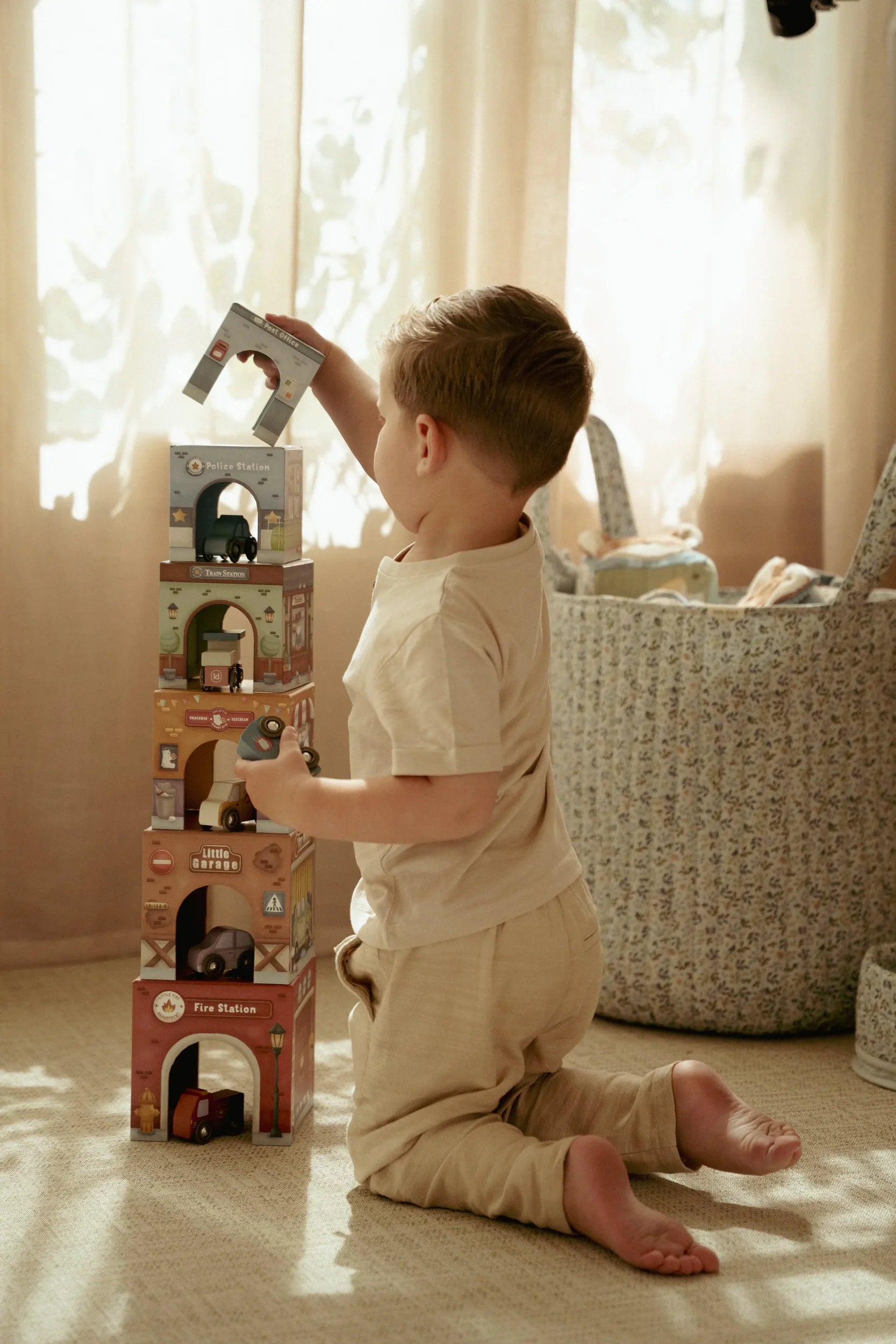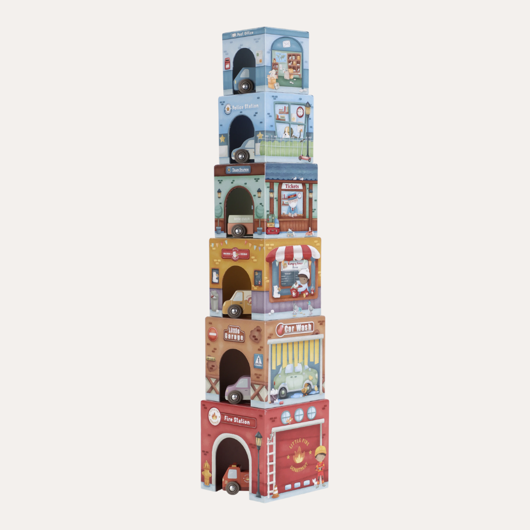 Stack, build, and discover a world of imaginative play. This charming set pairs six beautifully illustrated FSC cardboard blocks with perfectly matched vehicles, each adorned with unique artwork that sparks curiosity.