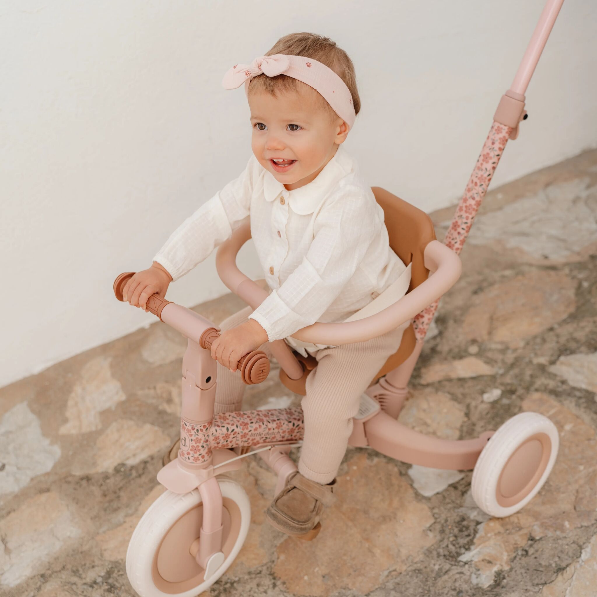 Zoom into adventure with the 4 in 1 Tricycle in charming pink floral design, designed to grow with your little one! Start with the Parent Push Trike mode for safe, supervised rides with harness and control bar. As confidence grows, switch to Pedal Tricycle to let your child practice pedalling while you still steer. Then, transform it into a Balance Bike to build balance and coordination, before finally turning it into a full Pedal Bike for independent rides. Adjustable rubber handles ensure a comfy grip at every stage of play. Perfect for endless fun and learning on wheels!