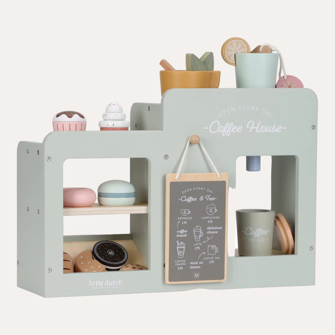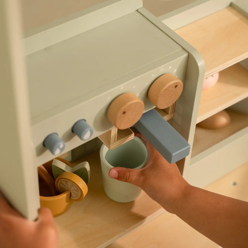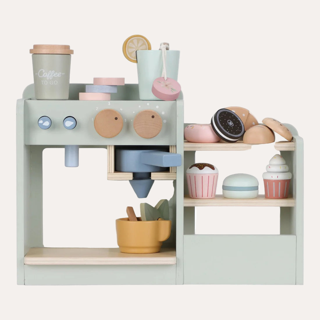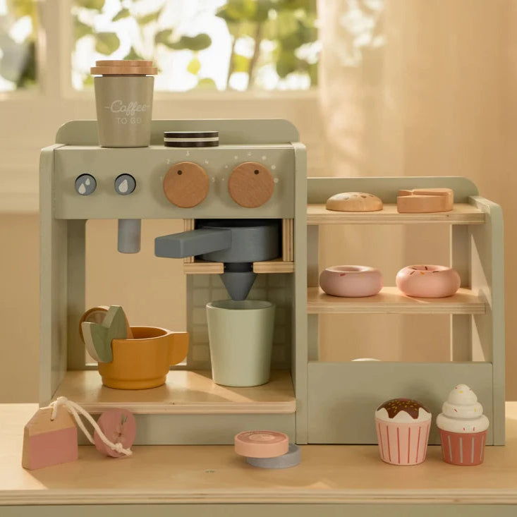 Welcome to the comfiest coffee corner around! Serve up a tasty cup of coffee or tea alongside a fresh sandwich or pastry. This charming toy coffee corner lets little ones press buttons, pick the perfect setting, and pop in a coffee pad for a real barista feel. The set includes a coffee and tea machine, cup storage, and a cabinet to showcase all the yummy treats. Who will be the first to place an order?