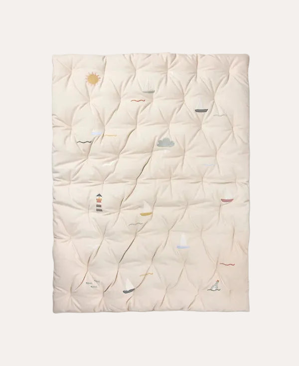 Meri Play Mattress, Sea Life Dive into imaginative play with this charming mattress featuring hand-embroidered sea-inspired designs on soft, undyed canvas. The SEA LIFE collection brings ocean wonder to life—from playful fish and swaying seaweed to dreamy underwater scenes that spark creativity and adventure. Crafted from natural, heavy-weight canvas in its purest form, this mattress celebrates sustainable comfort. The gentle texture comes from authentic cotton fibres, free from harsh bleaching agents and synthetic dyes. One side showcases the beautiful embroidery; the reverse offers a calm, neutral surface for versatile play and rest. Perfect for little explorers who love the sea, this thoughtfully designed mattress transforms playtime into a magical journey—ideal for napping, quiet moments, or endless imaginative adventures.