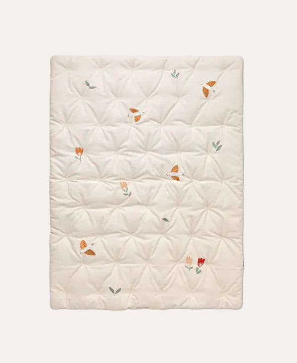 # Meri Play Mattress, Songbirds Bring the beauty of nature indoors with this enchanting play mattress adorned with delicate embroidered birds, blooming flowers, and graceful leaves. The SONGBIRDS design celebrates the wonder of the natural world in soft, cheerful colours that complement any nursery or playroom. Constructed from undyed, heavy-weight canvas, this mattress honours sustainable craftsmanship. The natural texture reveals authentic cotton fibres—free from harsh chemicals, bleaching agents, and synthetic dyes. One side features the gorgeous embroidery, while the reverse includes a clever attachment point at the top for hanging toys, perfect for tummy time exploration. Designed to grow with your child, this versatile mattress serves as a cosy play surface, rest spot, or quiet retreat for years to come. A timeless piece that brings nature's gentle magic to playtime.