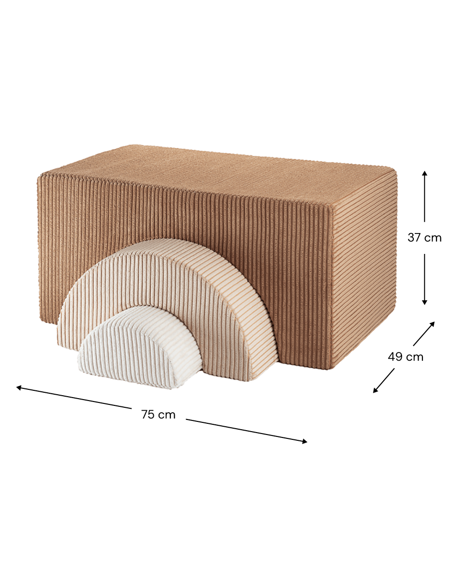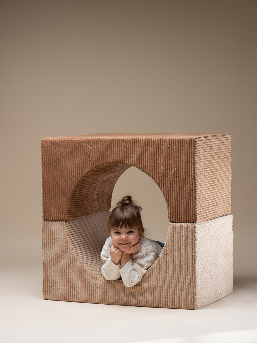 The Wigiwama Playset is a flexible, soft play set featuring three uniquely shaped pieces that open the door to endless imaginative fun. Kids can stack, build, or transform these pieces into a comfy chair, a playful table, stepping stones, or a snug little fort for adventurous play.