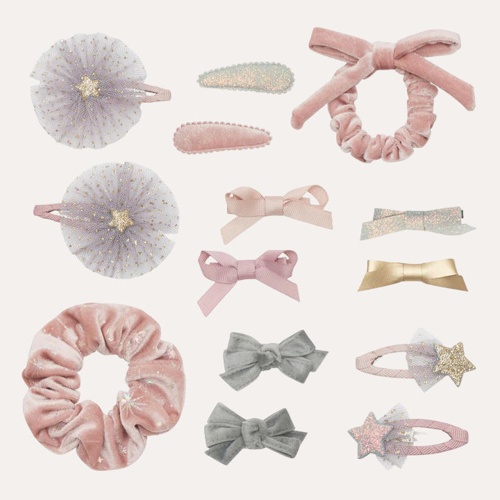 Celebrate the festive season with our elegant pink velvet stocking, thoughtfully filled with an assortment of hair accessories in a delicate blend of soft pinks, greys, and metallic tones. Presented ready for gifting, this stocking offers a seamless mix of charm and functionality. Designed to be reused, it can be conveniently refilled year after year, making it a timeless holiday treat.