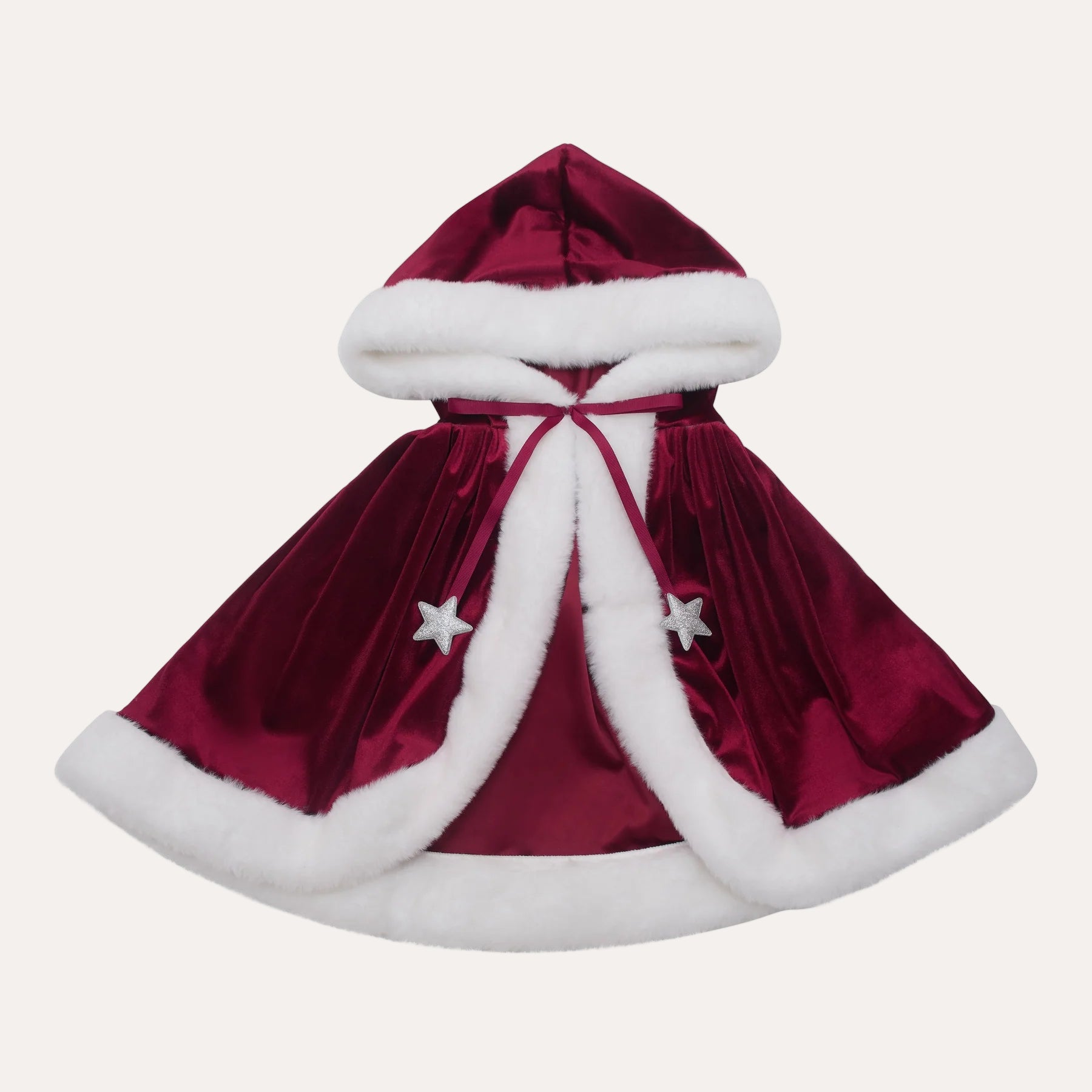 Celebrate the festive season with our delightful Mrs Claus cape, designed to inspire holiday cheer. Made from rich red velvet with a smooth satin lining, it features plush white trim and shimmering silver glitter star charms for added sparkle. Sized to comfortably fit children aged 3 to 10, the cape fastens securely with popper buttons and is accented by a red grosgrain ribbon bow. Measuring approximately 35cm in length, this cape is an ideal choice for festive dress-up and holiday play.