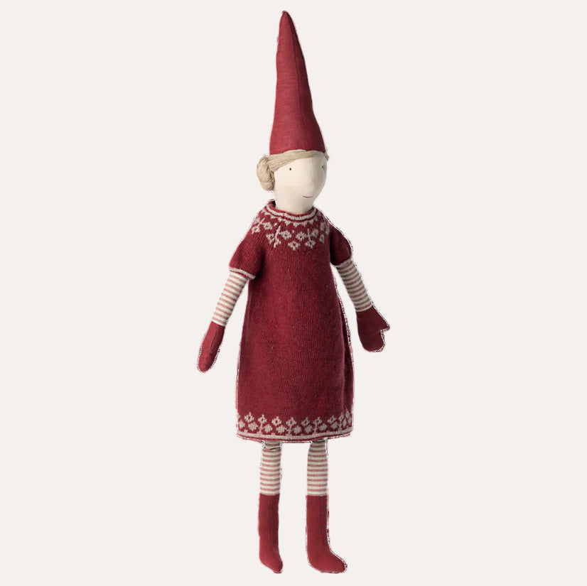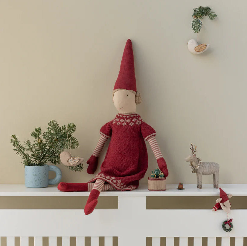 Bring festive joy into your home with this charming holiday companion. Dressed in a soft, hand-knitted lambswool outfit, she embodies the spirit of seasonal merriment and makes the perfect addition to your yuletide celebrations. A delightful way to share in the magic of Christmas with a character full of warmth and cheer.