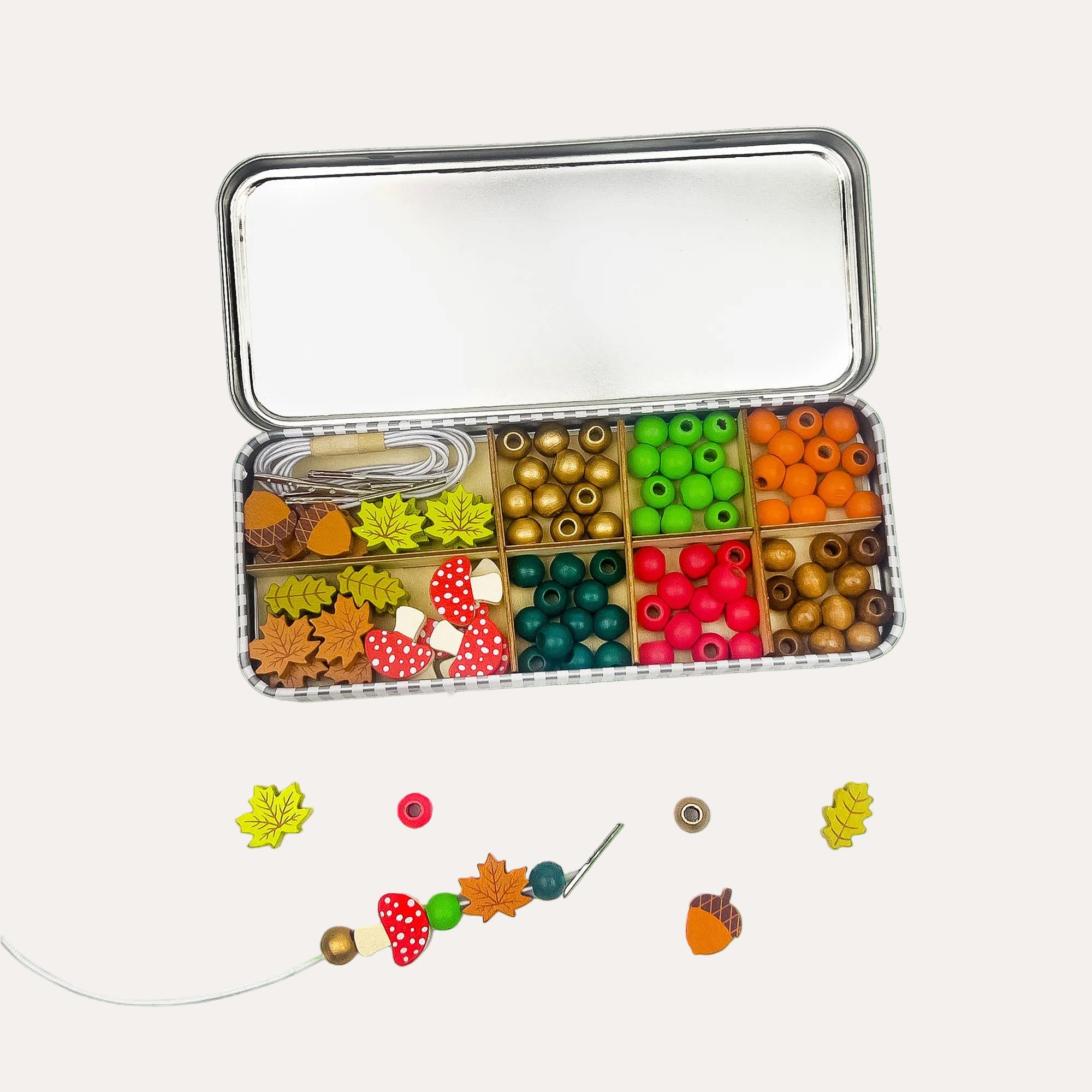 Tin, 6 wooden mushroom beads, 4 wooden acorn beads, 12 wooden oak & maple leaf beads, 60 spherical wooden beads, 5 white elastics with metal ends for easy threading