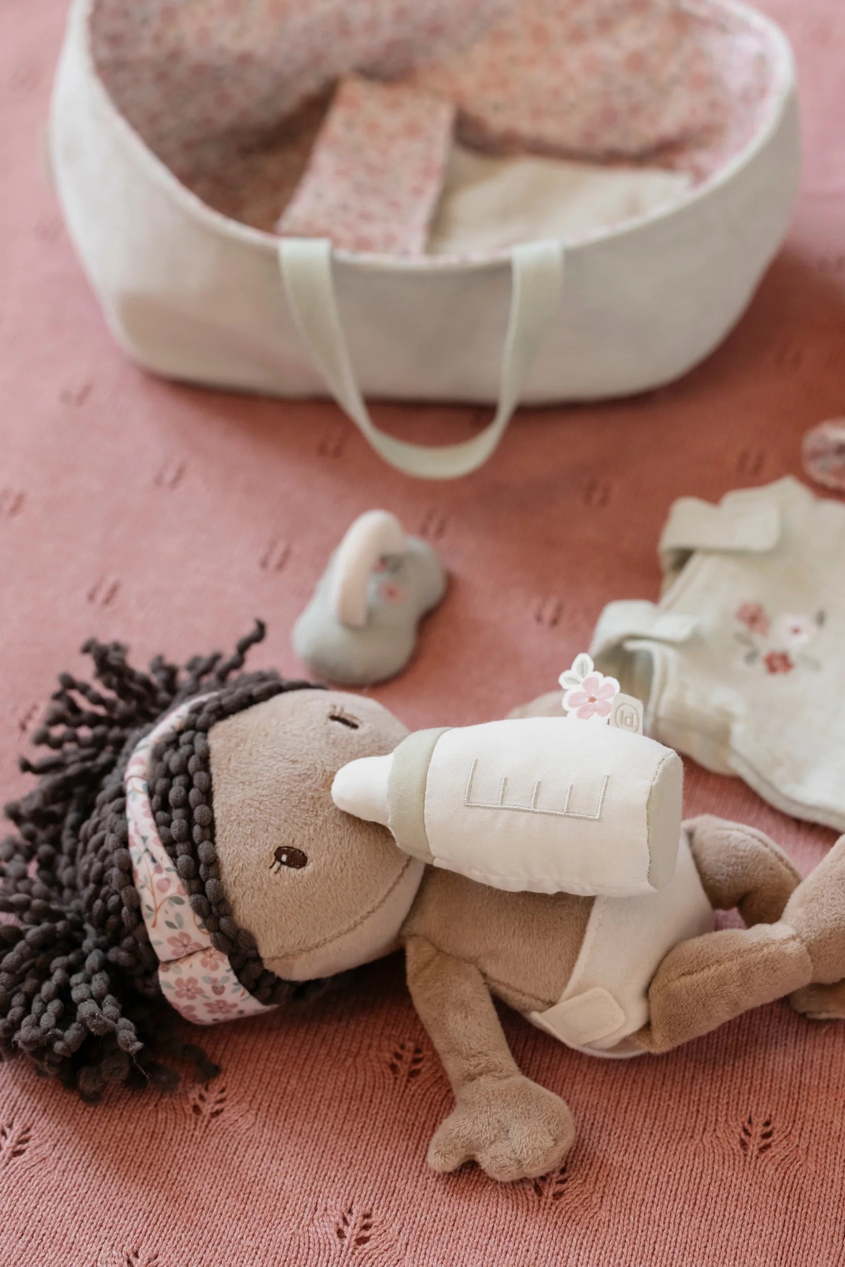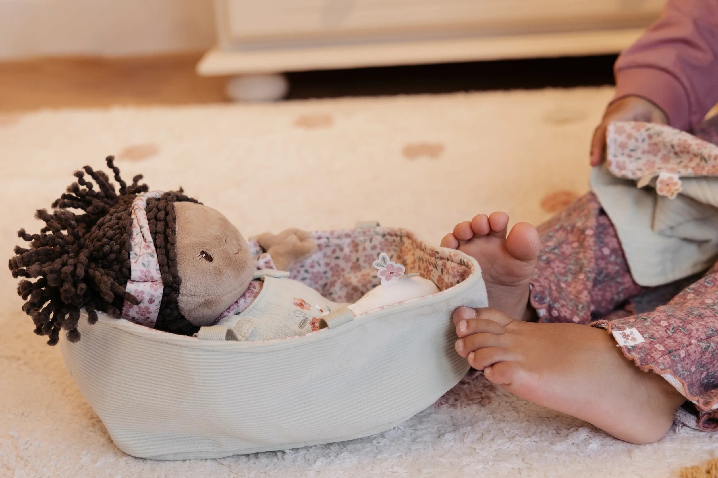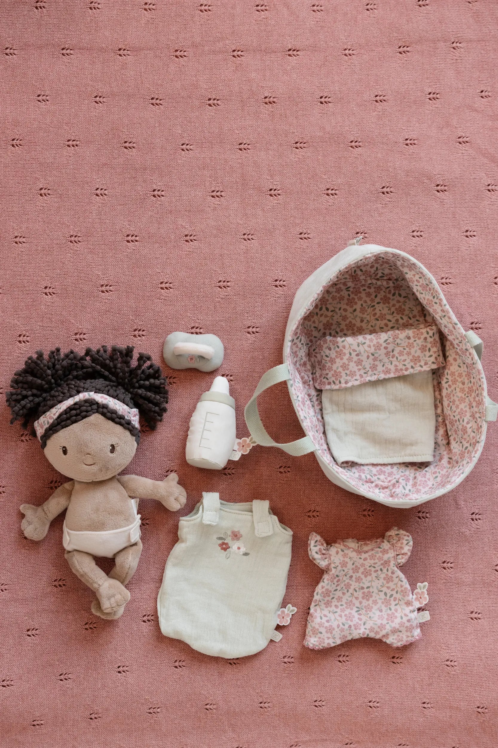 Introduce little ones to nurturing play with baby doll Evi, complete with her charming travel basket. This delightful companion arrives dressed in a cosy sleeping bag and removable romper, inviting endless dressing adventures. Magnetic pacifier and bottle attachments make feeding time seamless and mess-free. The ribbed fabric basket features a cheerful floral design, paired with a soft matching blanket—everything needed for imaginative cuddles and caregiving games that spark joy and creativity.