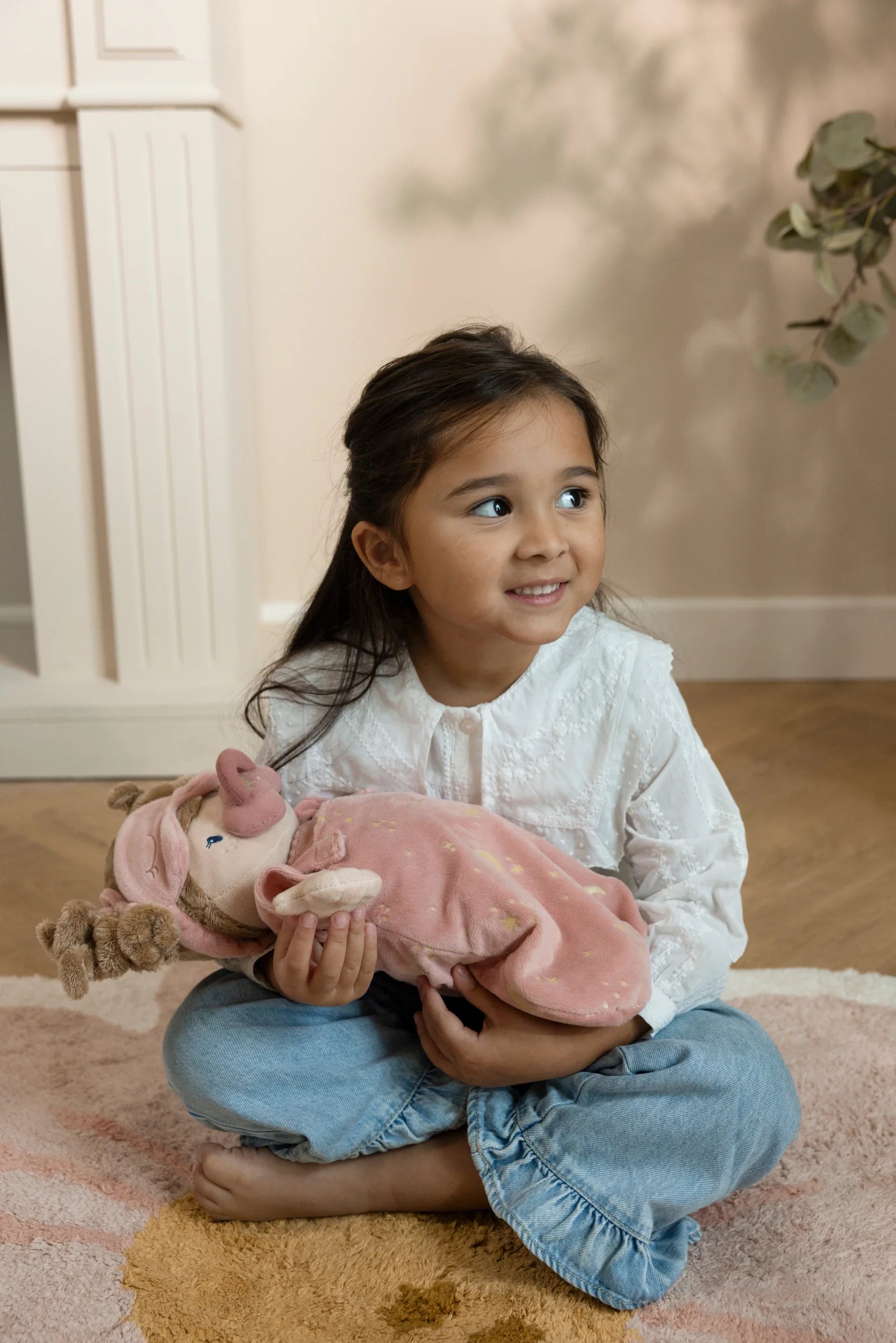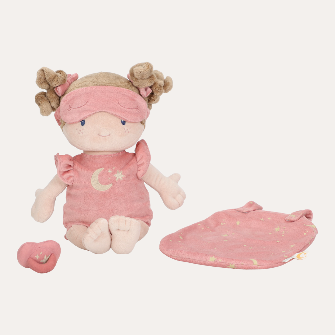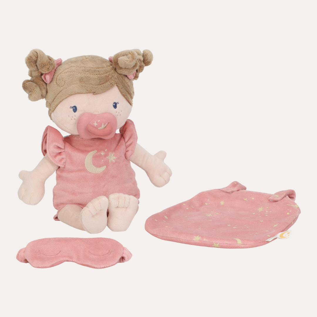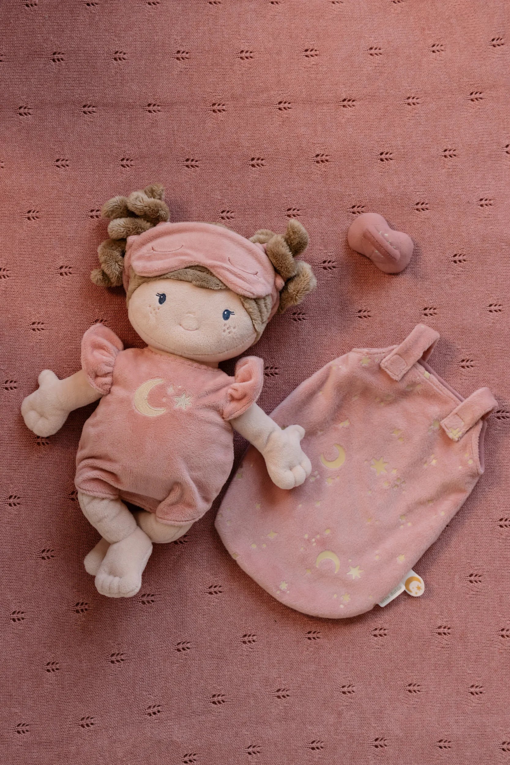 Introducing Rosa, your child's dreamy companion for bedtime and beyond. This adorable doll features a gentle expression, plush body, and a charming sleeping bag decorated with celestial moon and star designs. The removable romper and sleeping bag encourage imaginative role-play, letting little ones dress and undress Rosa for endless adventures. Perfect for cuddles, comfort, and creating cozy moments together.