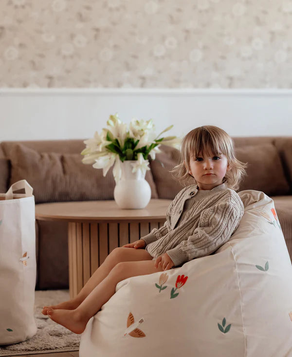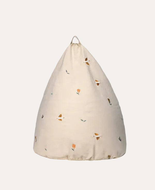 The bean bag chair is made from undyed heavy canvas, where the naturalness of the fabric is evident in the small, delicate nubs in the fabric, which originate from the shell parts of the cotton plant. Undyed fabric saves nature from unnecessary chemicals, such as bleaches and dyes. And we think it doesn't get more beautiful than here in its pure, natural colour. The chair has a nice and practical handle at the top, making it easy to take around the house. Suitable for children aged 3 and up, but can also be stolen by parents for bedtime reading.