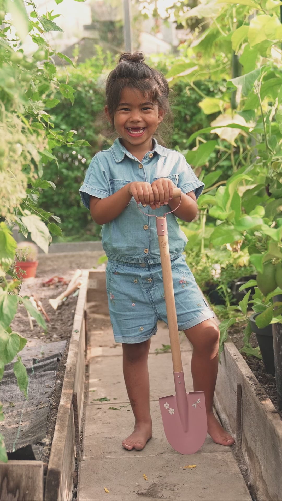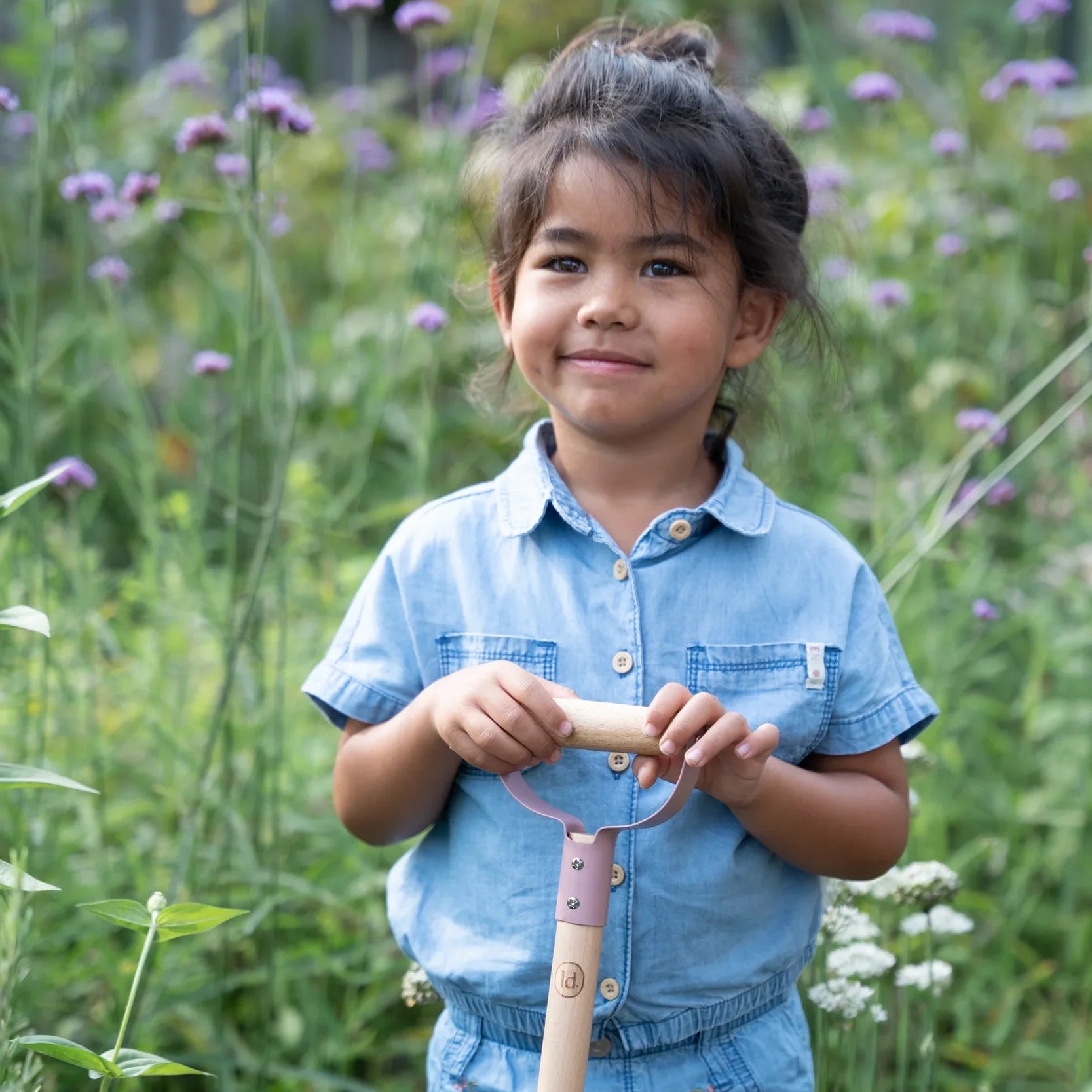 Discover the pink shovel from Little Dutch's children's garden collection! This shovel has a sturdy wooden handle and a metal blade, perfect for little hands. Decorated with beautiful illustrations of leaves and a cute beetle, inspired by the Fairy Garden collection. Whether working in the garden or playing in the sandbox, this shovel is always handy. The handle on top ensures a good grip, making scooping even easier. An indispensable tool for young explorers!