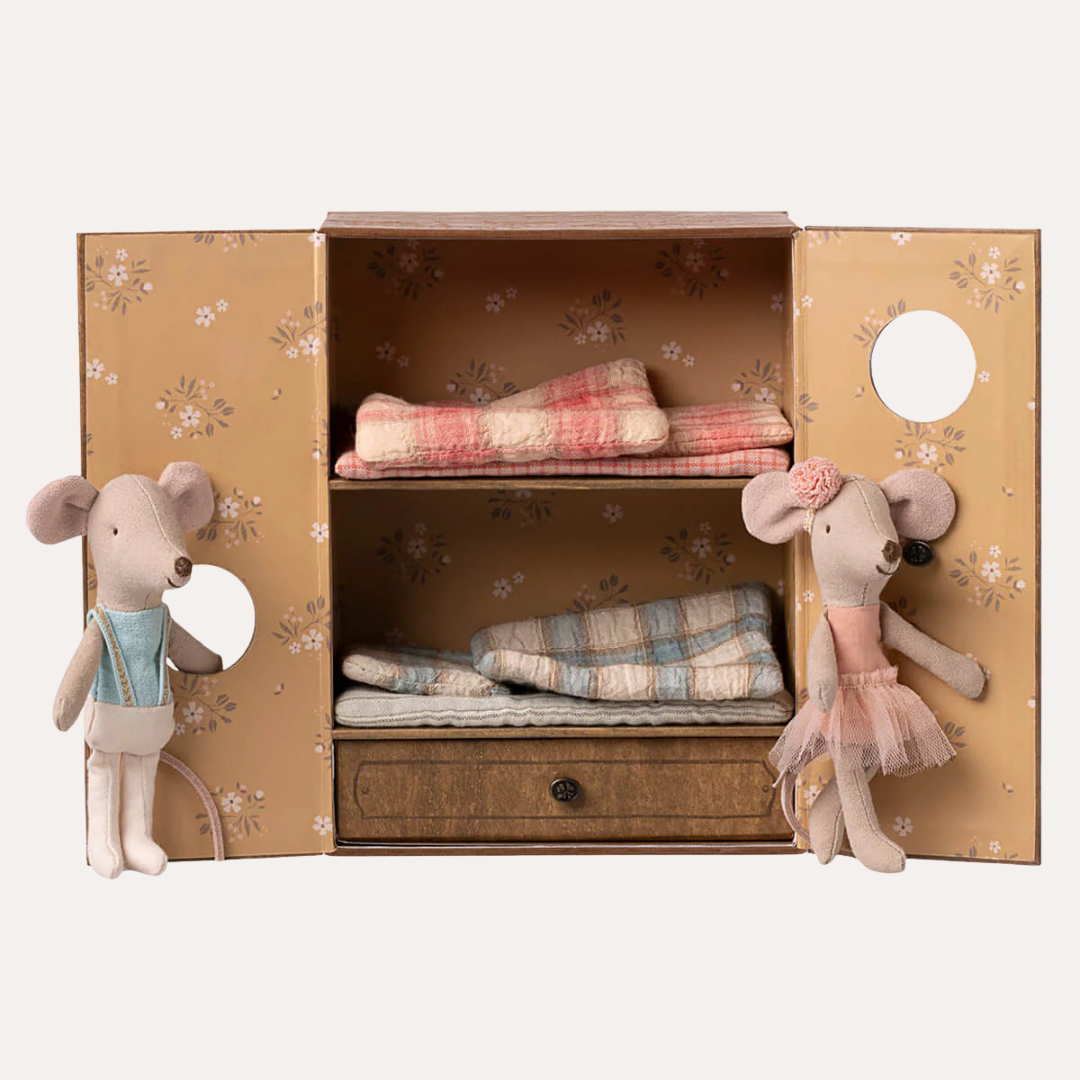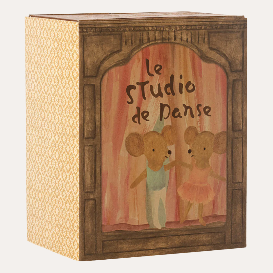 Meet the Ballet Mice in Dance Studio – where Little Sister and Brother perfect their pirouettes! This enchanting playset features a mirrored wall and ballet bar for endless rehearsal possibilities. The clever fold-out design transforms the box into a performance space, then flips to reveal cosy bunk beds for post-show rest. Crafted with Maileg's signature charm and detail, this keepsake set sparks hours of creative storytelling and graceful play.