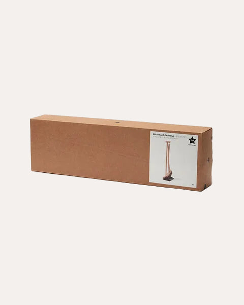 Storage rack: Plywood, pine, beech. Mop: Pine, beech. Cloth for mop: Polyester, cotton. Hand brush: Beech, PET. Broom: Beech, coconut fiber. Dustpan: Plywood, pine. Dammvipa: Book. Towel, string: Cotton.