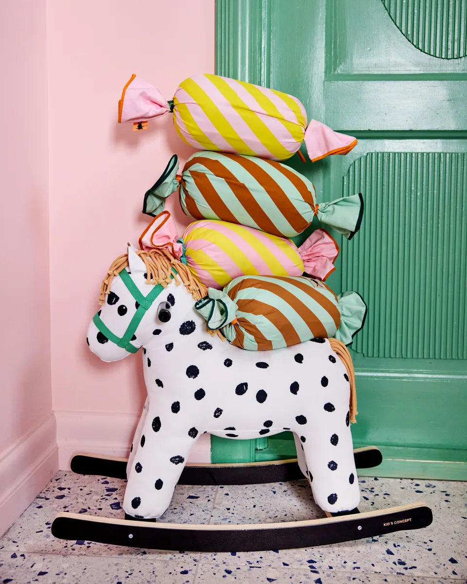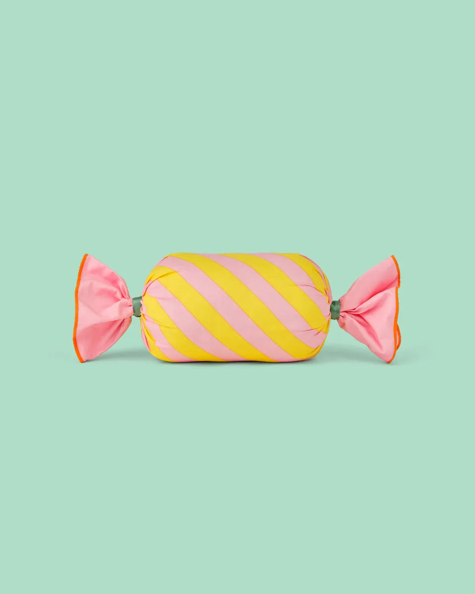 Inspired by Pippi Longstocking's legendary sweet-shopping spree, this whimsical cushion captures the magic of those twist candies in soft, cylindrical form. Tied ends mimic wrapped sweets, while cheerful diagonal stripes bring joy and personality to any space.