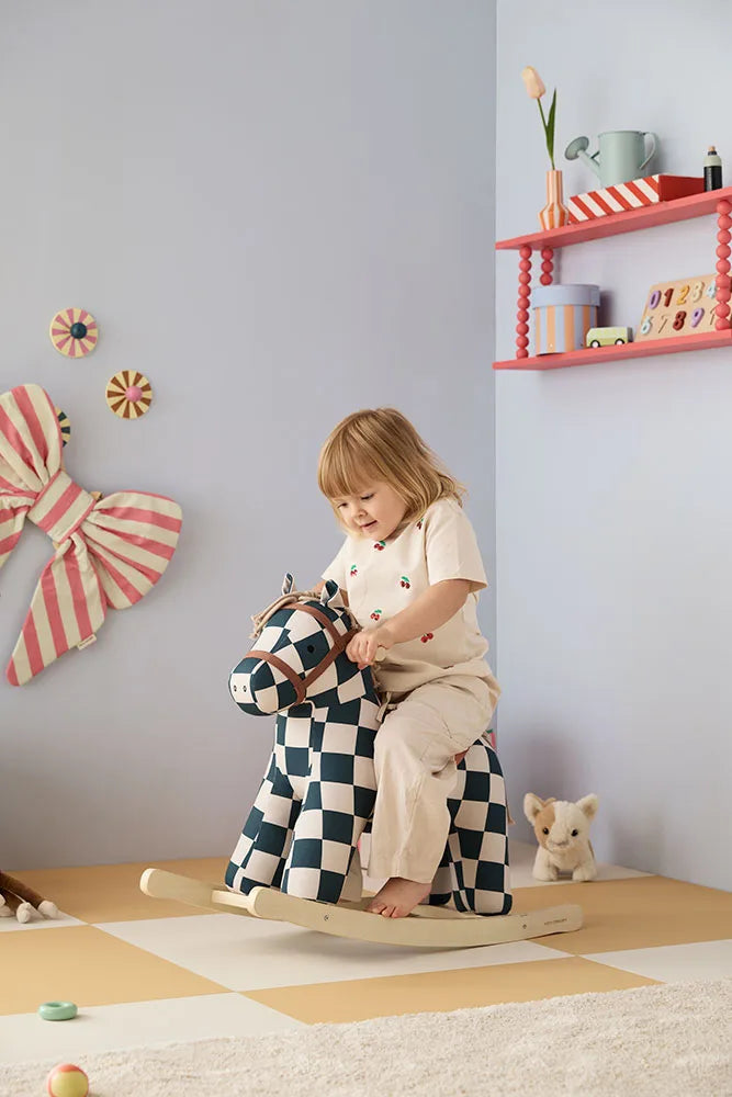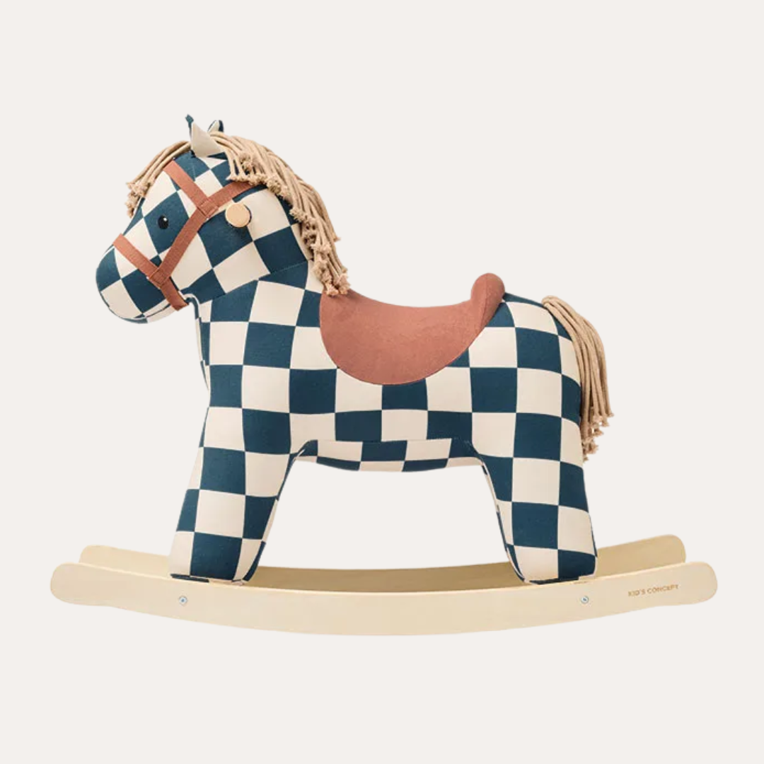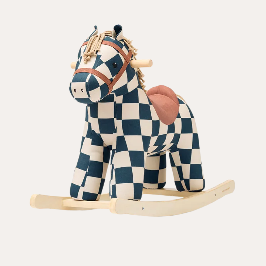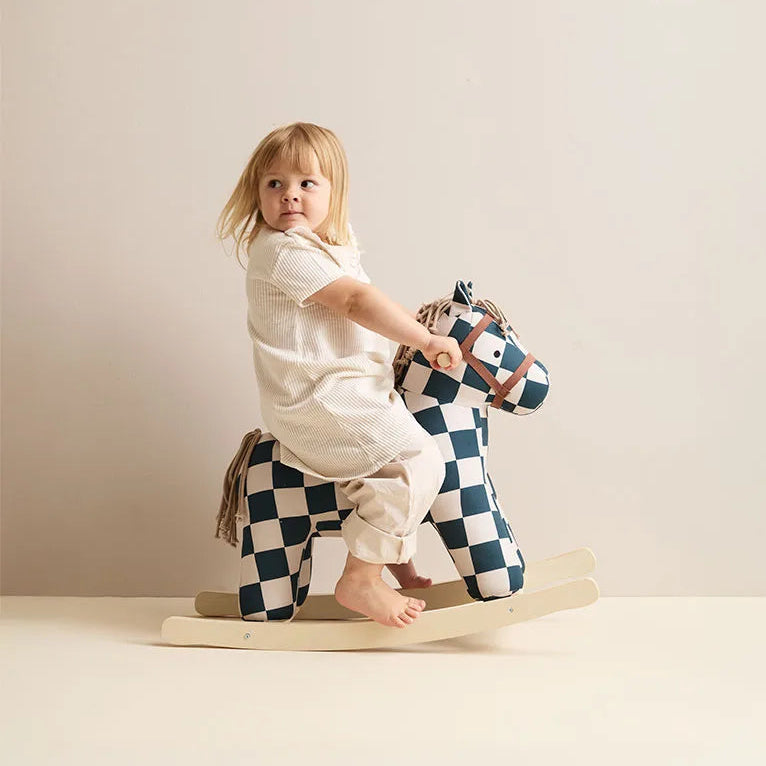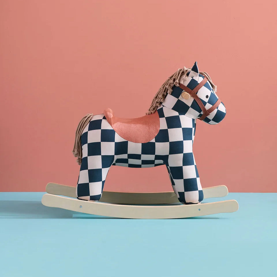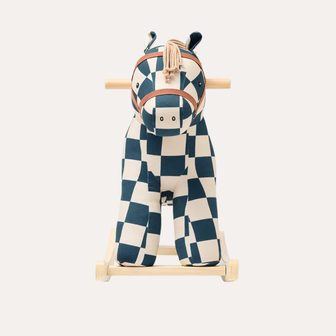 Meet Miro, the chicest rocking horse in town. Dressed in a sophisticated dark teal check-patterned canvas coat, this fashionable friend is ready to bring playful elegance to your nursery. Whether he's fresh from a fashion show or a circus adventure, Miro knows how to make an entrance. Soft, touchable mane and tail invite cuddles and imaginative play, while sturdy hand grips keep little ones secure.