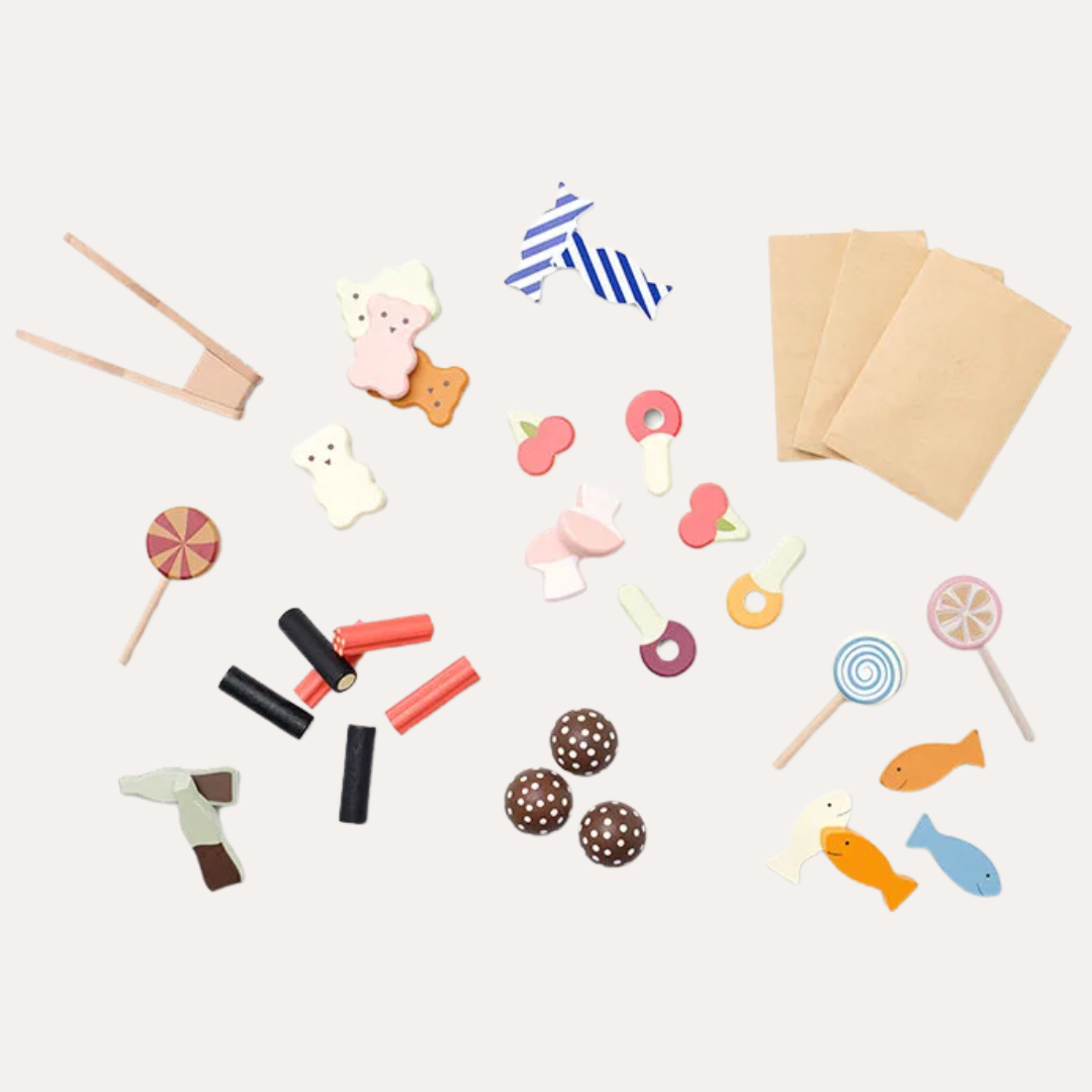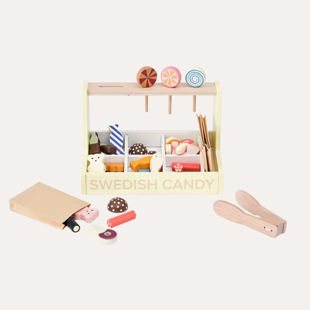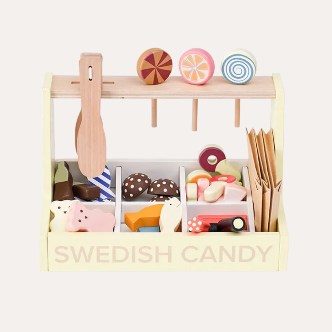 Get ready for sweet fun with the Swedish Candy Set by Kids Concept! This charming wooden candy shop is packed with goodies like gummy bears, cola bottles, chewy cherries, and lollipops—all crafted from wood. Don’t miss the famous salty liquorice sticks paired with raspberry for a perfect combo! Inspired by Sweden’s “lördagsgodis” tradition, this set includes 36 pieces; a candy stand, pliers, paper bags, and wooden candy pieces. Kids can practice their motor skills while pretending to buy and sell sweets, sparking creativity and hours of playful storytelling. Let the candy shop adventures begin!