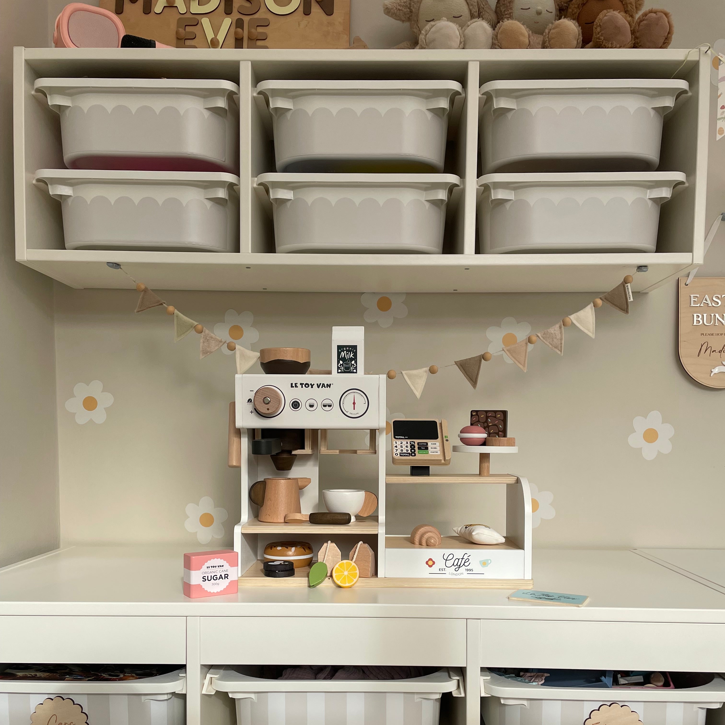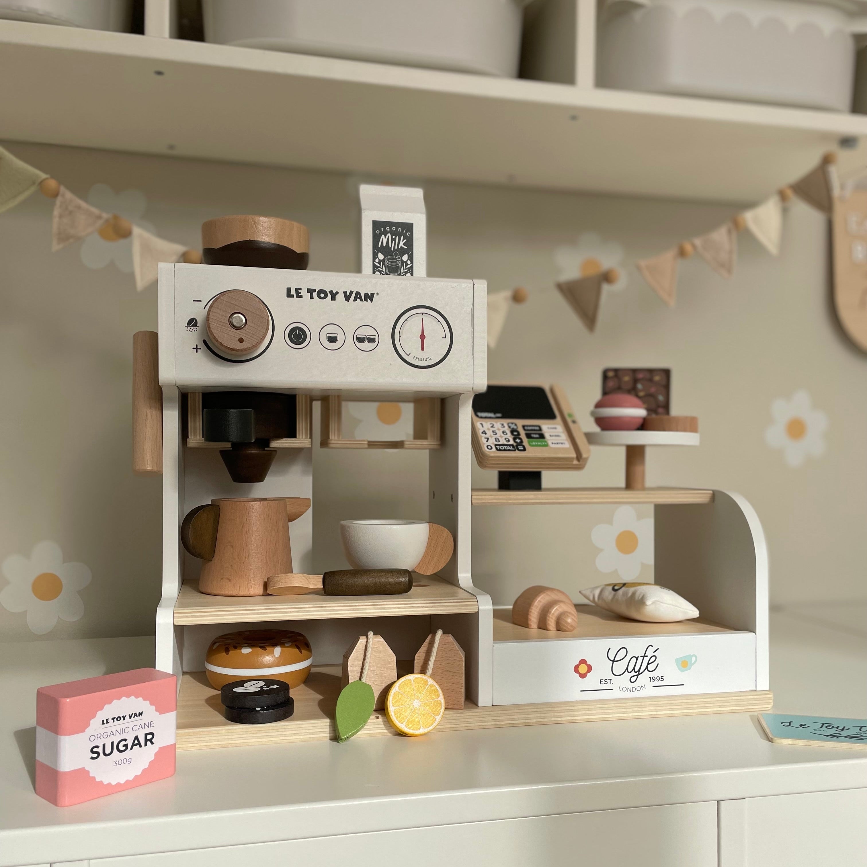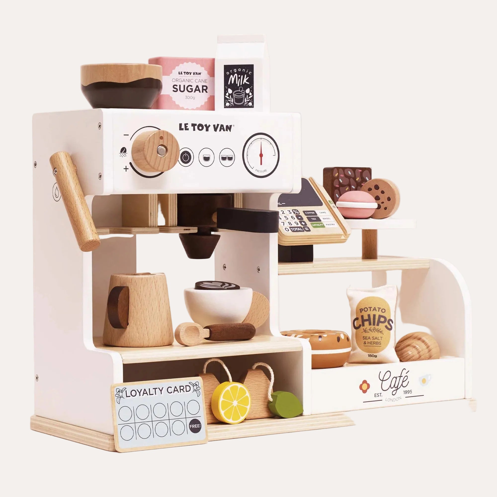 Whats included? Cookie, macaron, brownie, croissant, bag of crisps, bagel, tea bag, lemon tea bag, milk carton, sugar, loyalty card, spoon, milk jug, mug, 2 latte art, coffee grinder, portafilter, milk frother, till chalkboard tablet, coffee machine dials and display shelving.