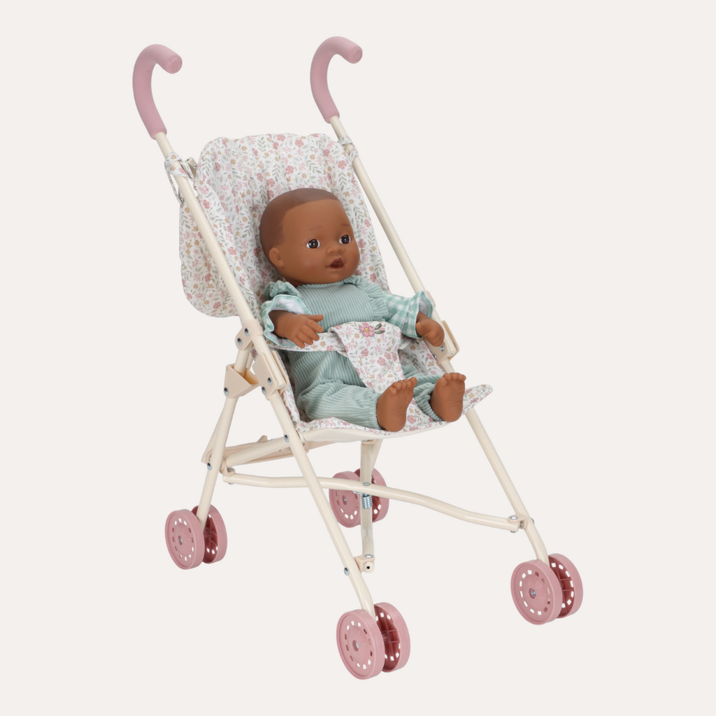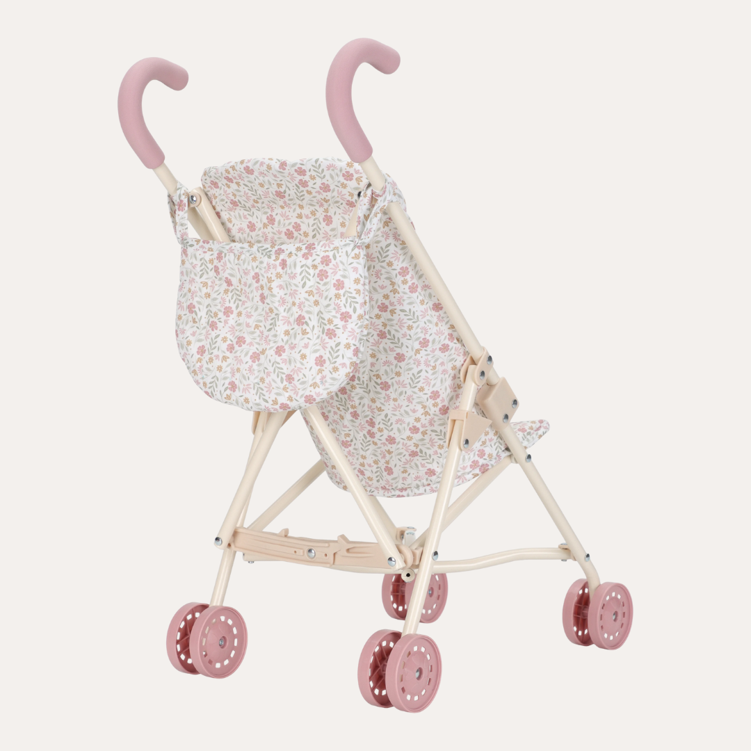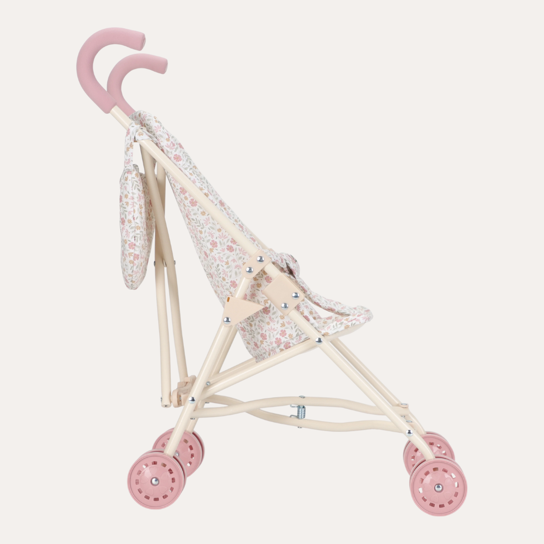 The Little Dutch Metal Doll Stroller in White invites your little one to take their favourite doll or cuddly toy on exciting adventures. Adorned with charming floral prints, the seat includes a matching bag on the handles to carry all the doll’s essentials. A strap keeps the doll safe as your child pushes the pram with its white metal frame and pink handles and wheels. Easy to fold for storage, this stroller sparks imaginative play while teaching little caregivers important life skills.