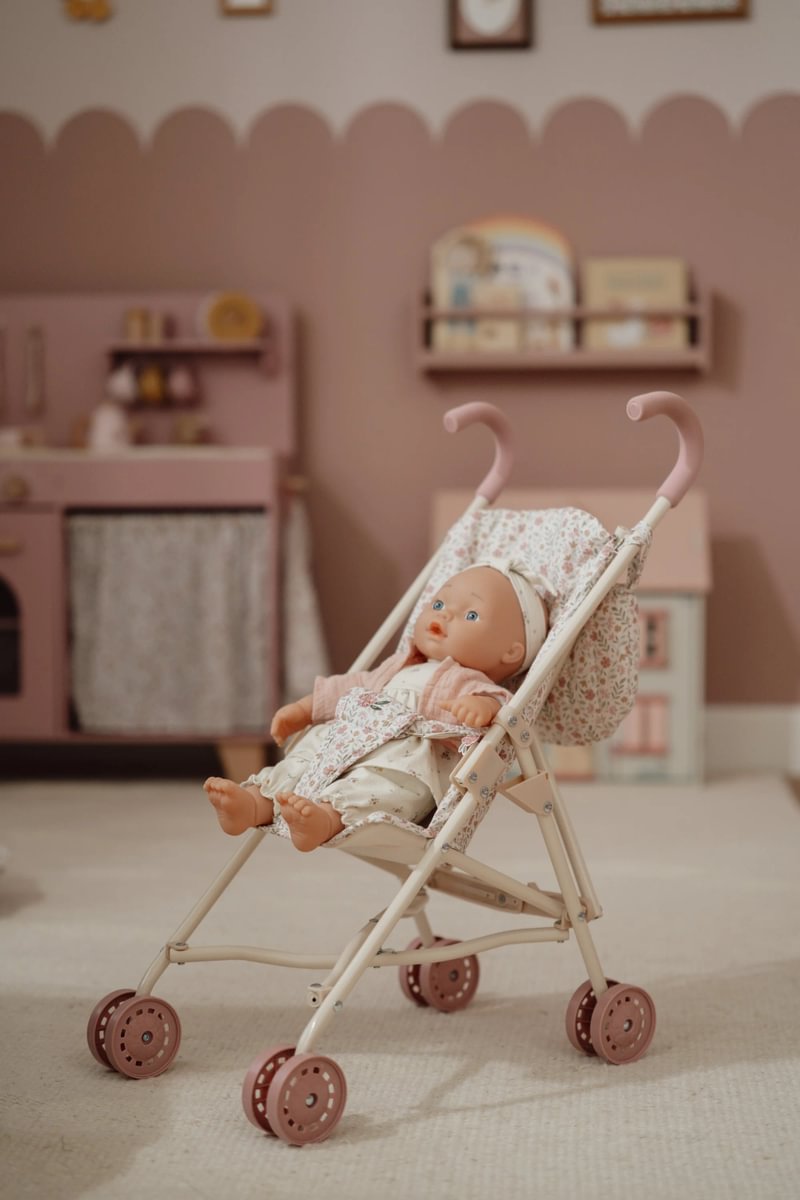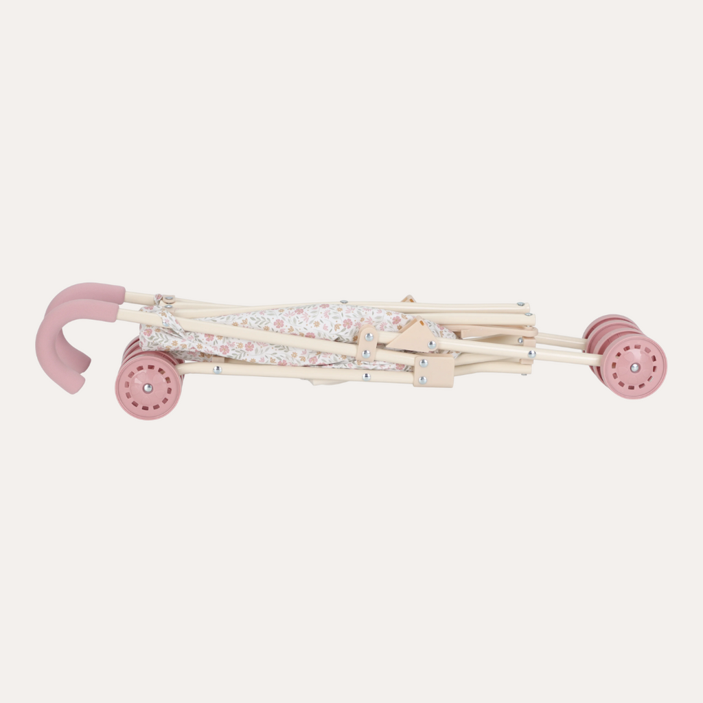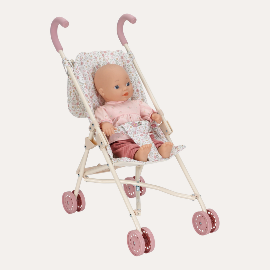 The Little Dutch Metal Doll Stroller in White invites your little one to take their favourite doll or cuddly toy on exciting adventures. Adorned with charming floral prints, the seat includes a matching bag on the handles to carry all the doll’s essentials. A strap keeps the doll safe as your child pushes the pram with its white metal frame and pink handles and wheels. Easy to fold for storage, this stroller sparks imaginative play while teaching little caregivers important life skills.