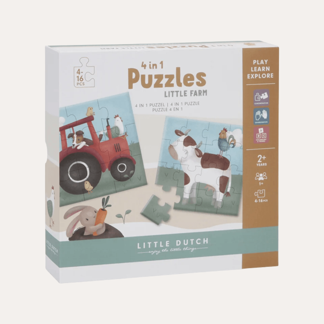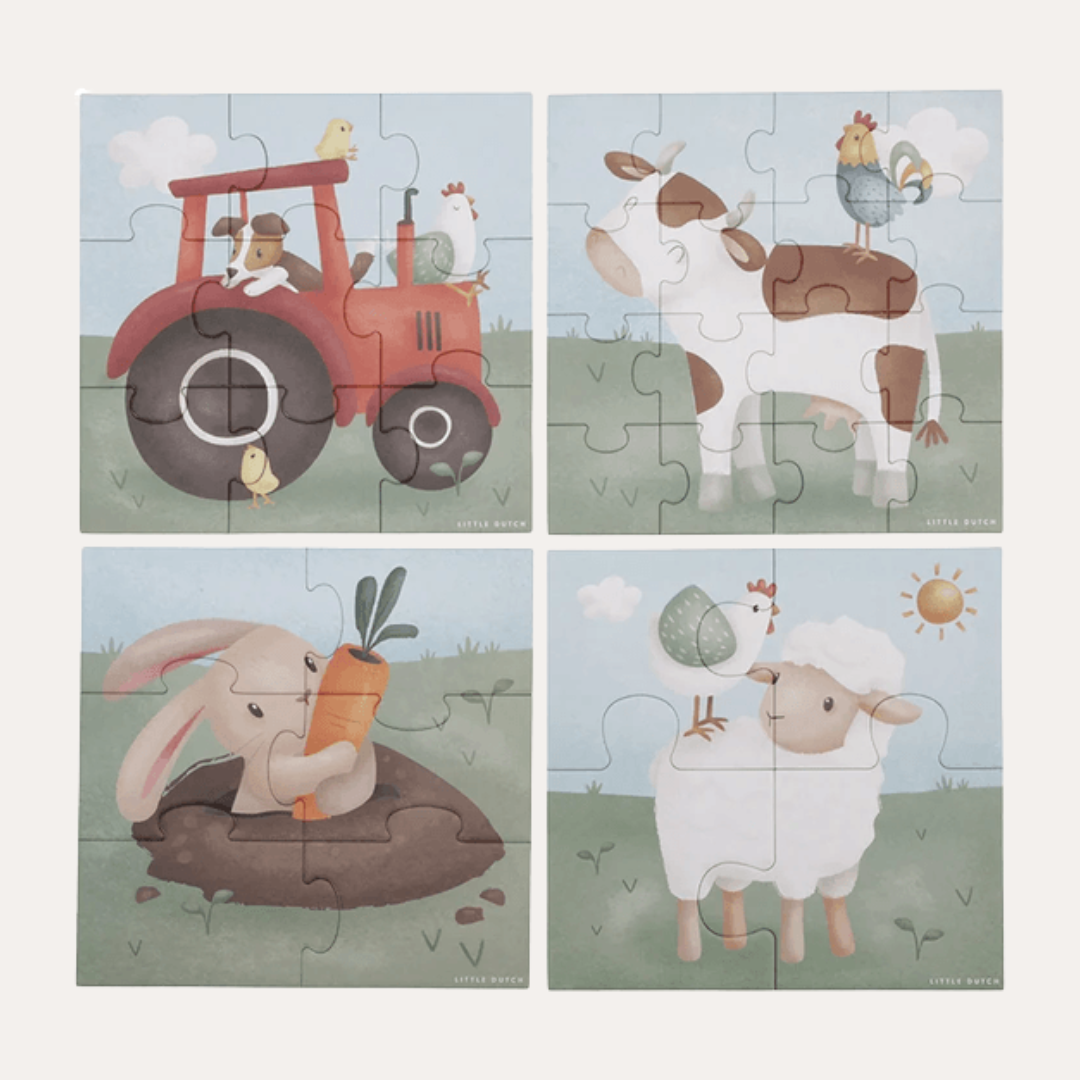 Introduce your little one to the charming world of Little Dutch's farm with four progressive puzzles designed to grow with them. Starting at just 4 pieces and building to 16, each puzzle gently strengthens fine motor skills, hand-eye coordination, and vocabulary as children discover delightful farm animals.