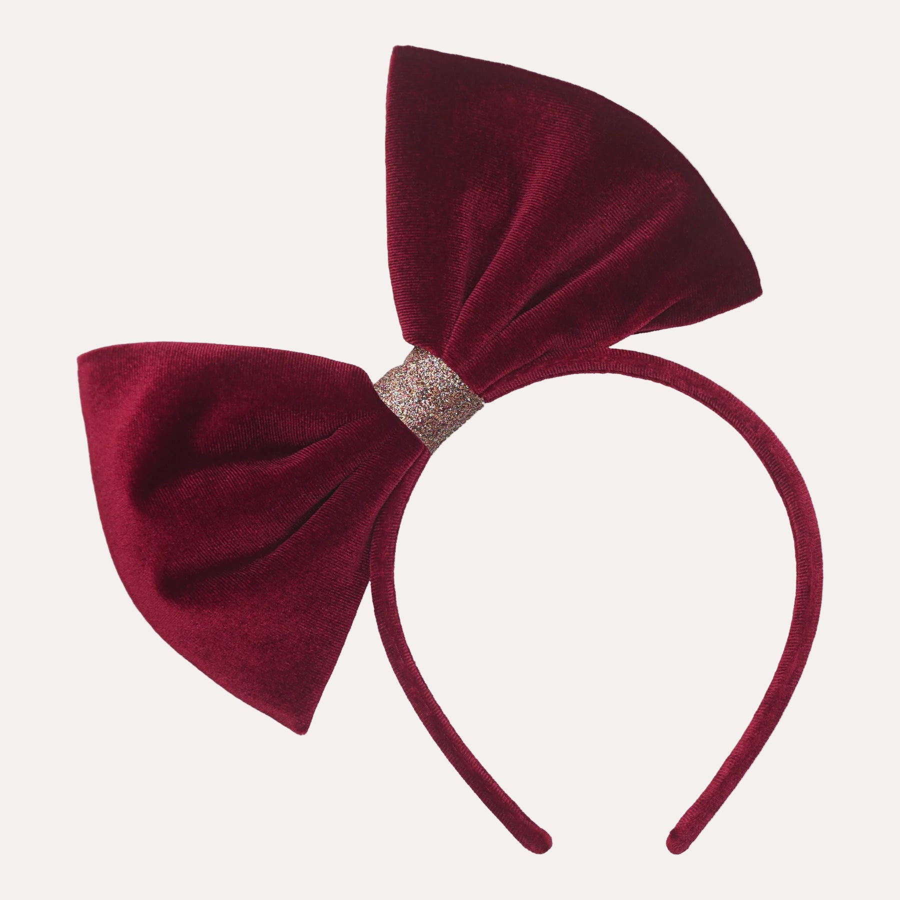 Headband wrapped in rich burgundy velvet fabric adorned with an oversized matching burgundy bow to one side with a glitter central wrap