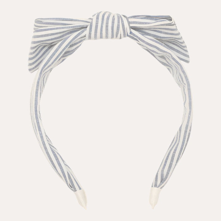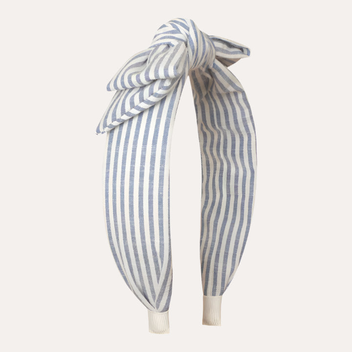 This charming striped Alice and is perfect for seaside adventures and everyday wear alike! Designed to keep hair neat on windy beach days, it fits ages 3 to 10 years. Made from soft blue and white striped fabric, it features a cute central bow and grosgrain ribbon-wrapped ends. Warning: Not suitable for children under 36 months!