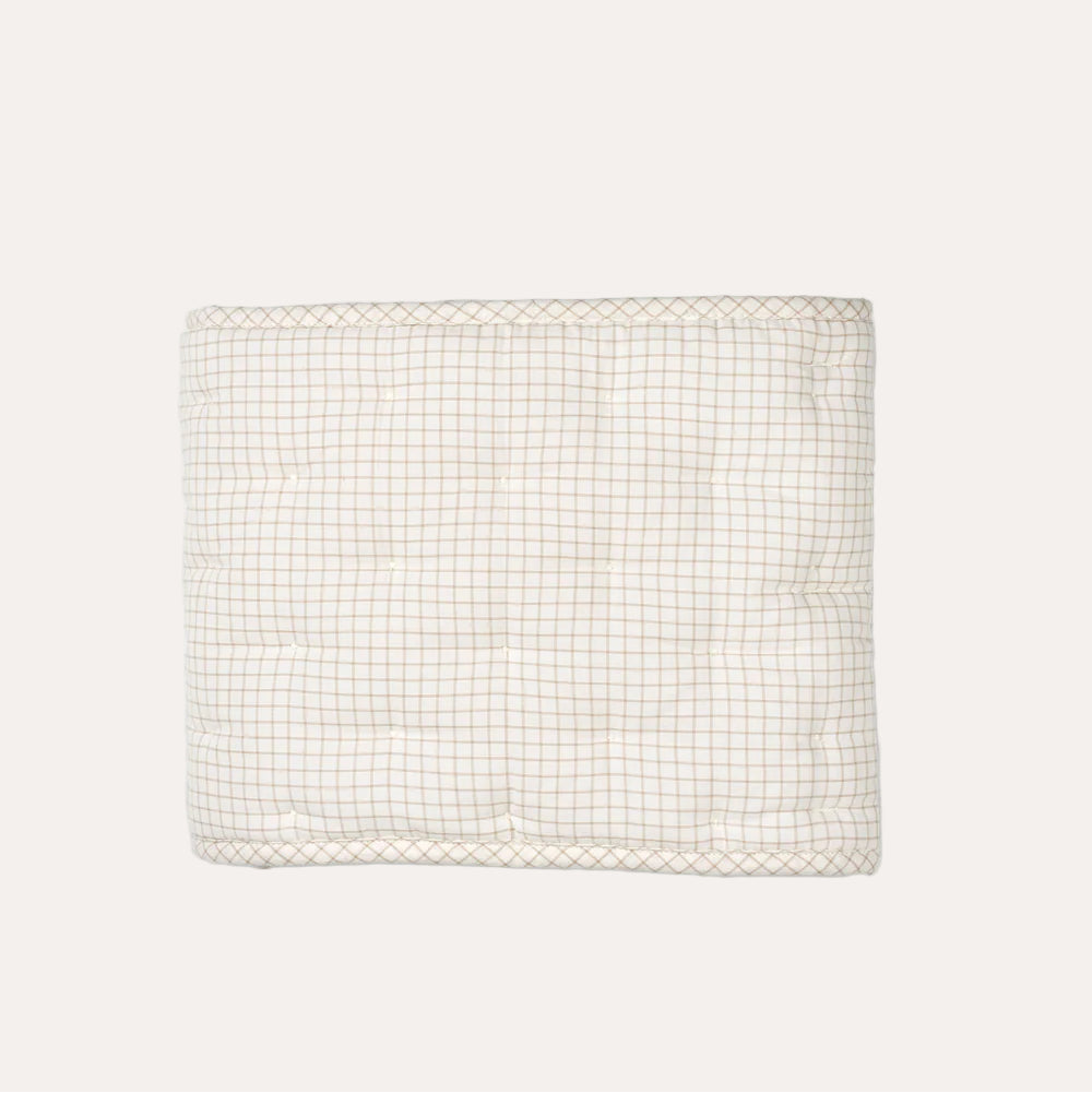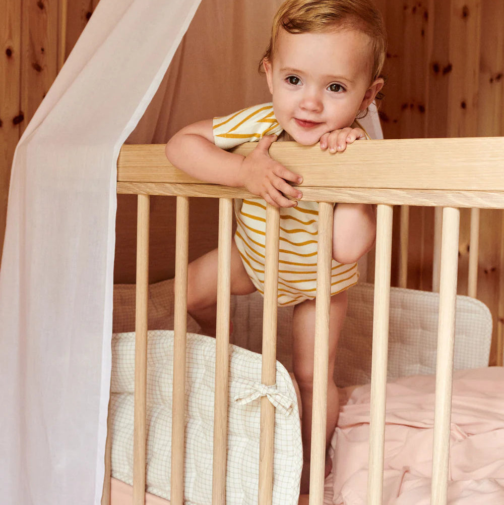 This mini check cot bumper features a quilted design with delicate ribbons for secure attachment to the bed. Measuring approximately half the length of a standard cot, it promotes airflow while offering a soft, comfortable barrier that enhances your baby's sleeping environment. Its thoughtful construction balances safety and cosiness for peace of mind during rest.