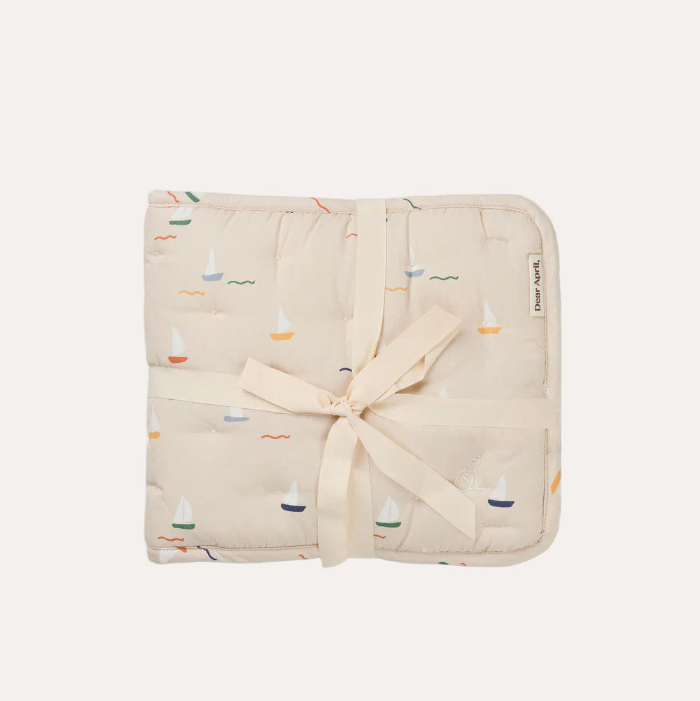 The Pond Boats cot bumper combines a soft, quilted texture with fine ribbons for secure attachment, ensuring it stays in place on your baby's bed. Designed to cover approximately half the length of a cot, it promotes adequate ventilation while creating a cozy and safe sleeping environment. This bumper balances comfort and safety to support restful sleep.