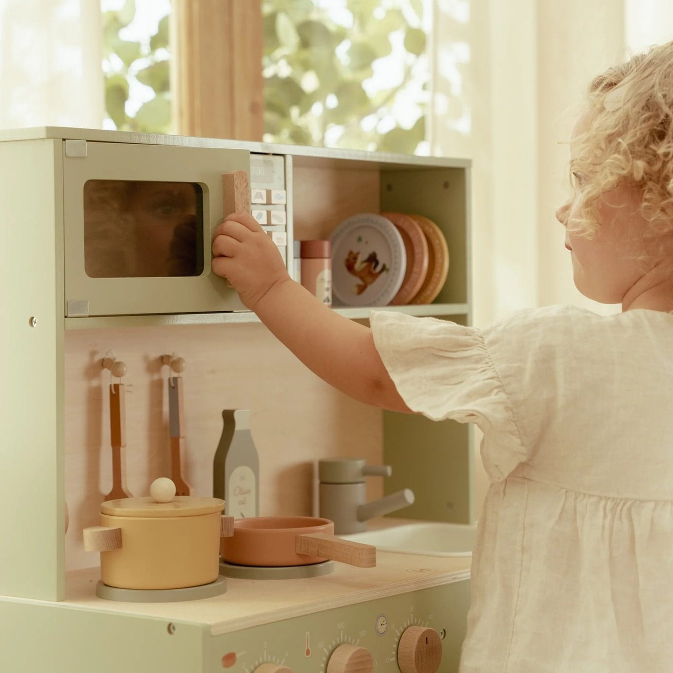 The delightful mint-toned wooden play kitchen invites kids to bake cakes, stir-fry veggies, or fry eggs with real knobs on the microwave adding to the fun. With two pans, cooking tools, plates, a sink, and extras like olive oil, salt and pepper shakers, plus a cupboard to keep things neat, the culinary adventures never stop! Prepare for a juicy playtime with this charming wooden slicing fruit set too! It includes six colourful fruits—apple, pear, banana, kiwi, orange, and watermelon—each splitting neatly in half with a wooden knife and sticking back together thanks to Velcro. Perfect for little chefs to safely practise cutting while enjoying endless imaginative fun.What tasty treats will your child create today?
