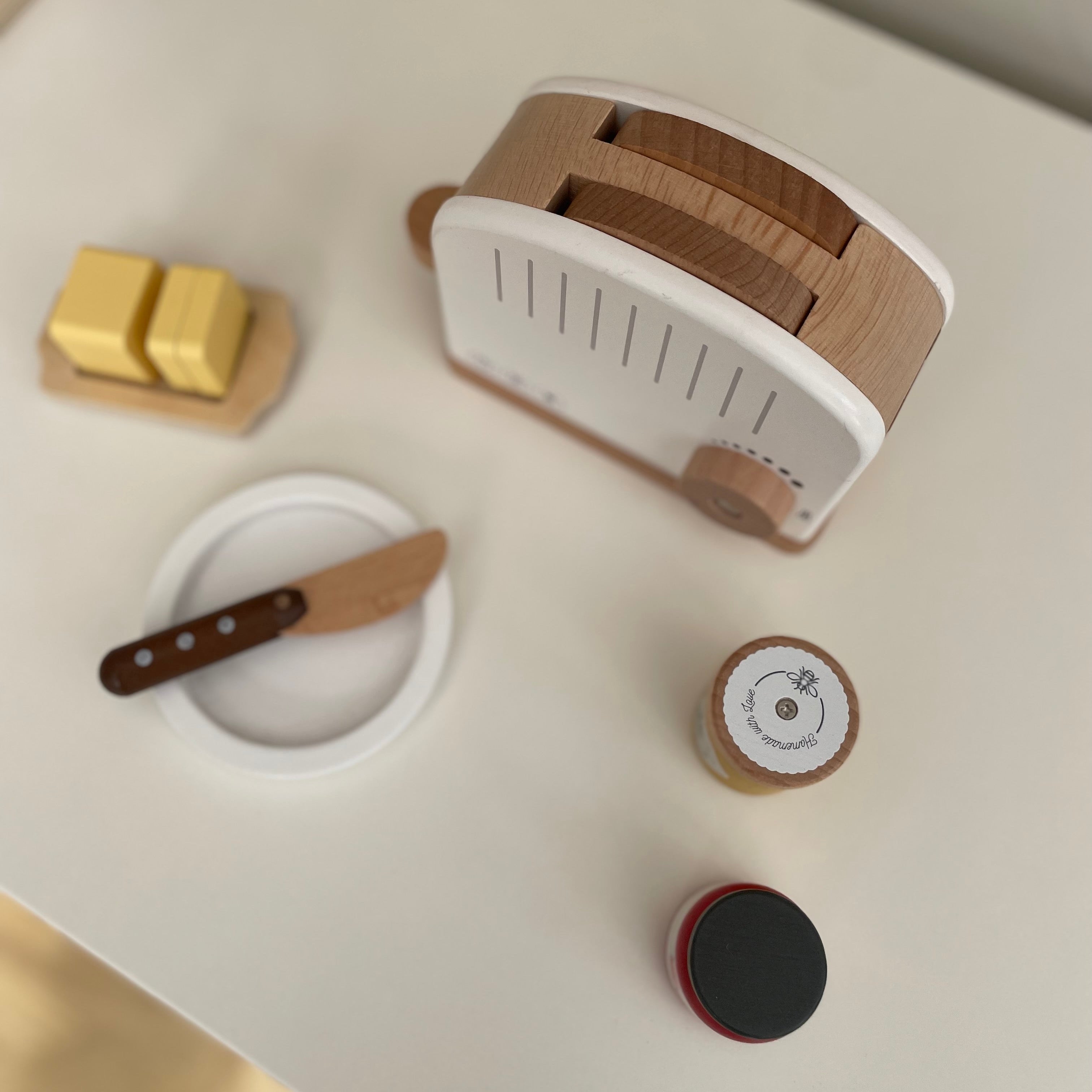 This beautifully crafted set features a classic pop-up toaster with temperature dial, two wooden toast slices, sliceable butter with dish, honey pot with dipper, strawberry jam jar, wooden knife, and plate.