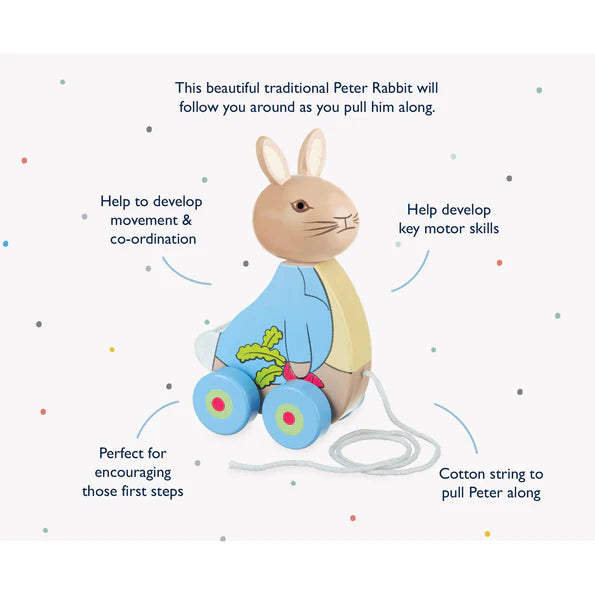 Make friends with this wonderful wooden handcrafted Peter Rabbit pull along toy. Painted in a gorgeous baby blue, this charming character will hop along beside you as you pull him through your adventures. Perfect for encouraging those crucial first steps, this delightful toy combines classic storybook charm with developmental benefits. The smooth wooden construction is gentle on little hands, while the satisfying pull-along motion helps build coordination and confidence. Watch your little one's face light up as their new furry friend tags along on every journey around the house and garden. A timeless toy that brings the magic of Beatrix Potter's beloved tales to life.