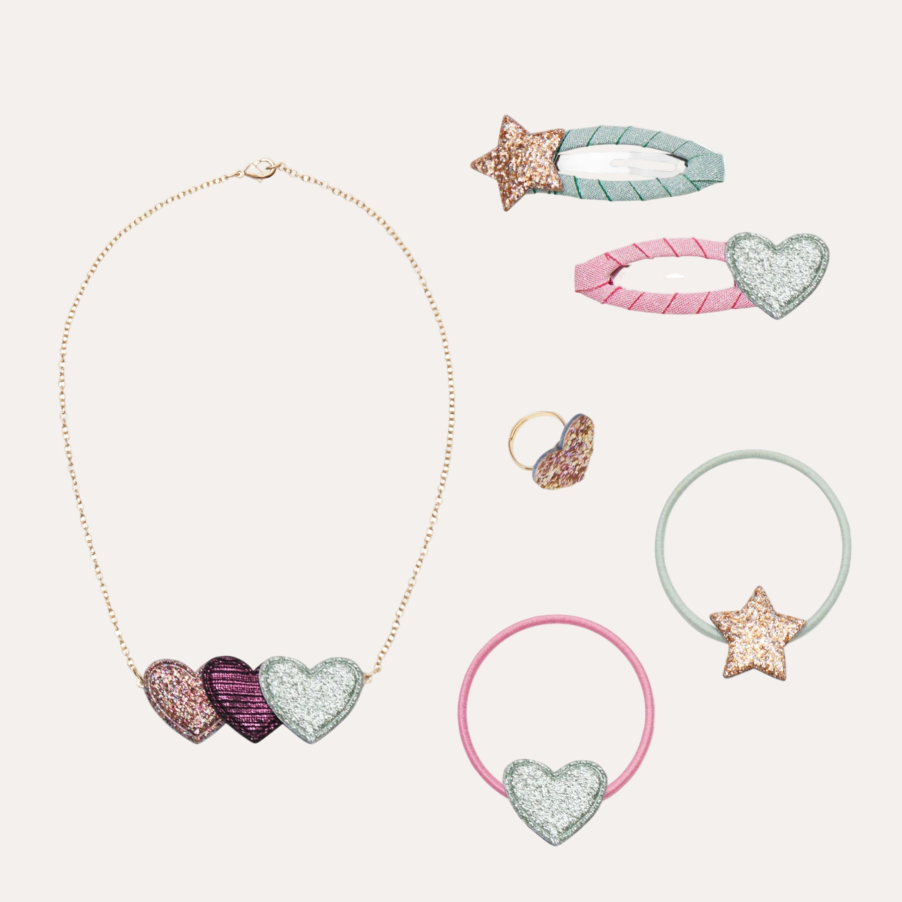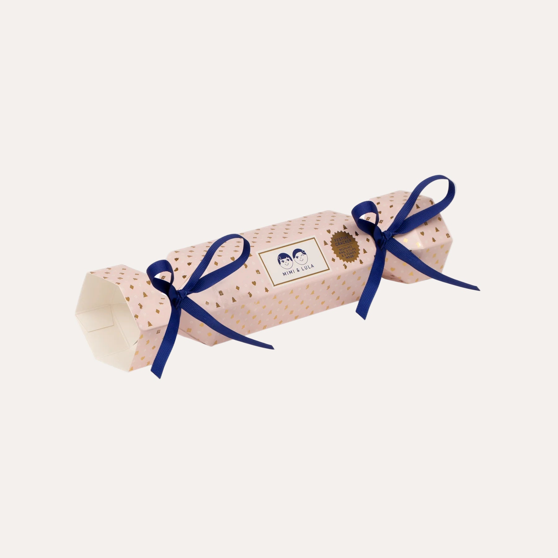 This elegant gift cracker is the ideal present for accessory enthusiasts this holiday season. It includes six limited edition items: a necklace adorned with three glitter hearts, a matching ring, two ponytail holders, and two clic clac clips featuring heart and star designs. Expertly presented and finished with navy grosgrain ribbon bows, it measures approximately 29cm. Perfect for adding sparkle to any outfit, this set offers enjoyment well beyond Christmas. Please note, it is not suitable for children under 36 months.