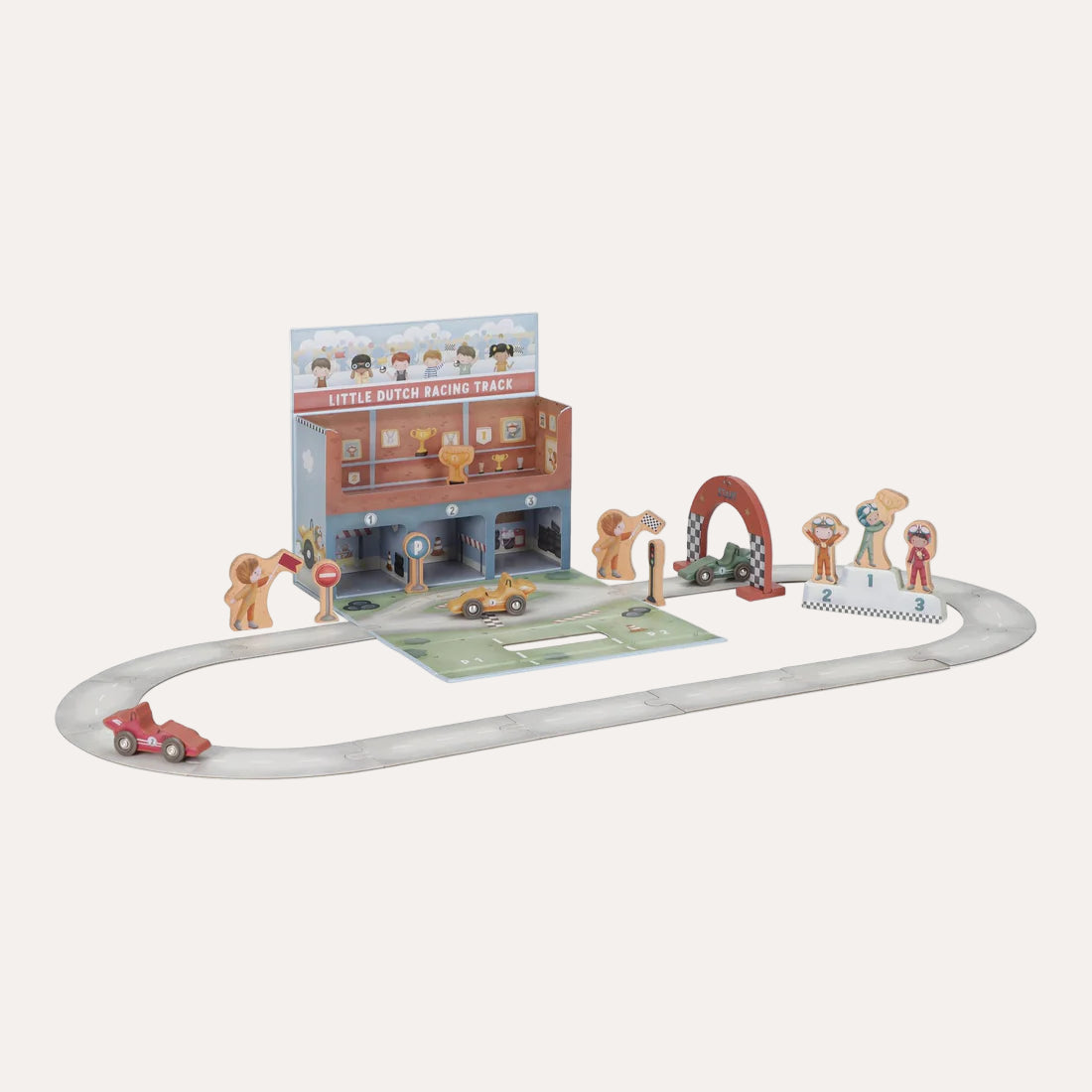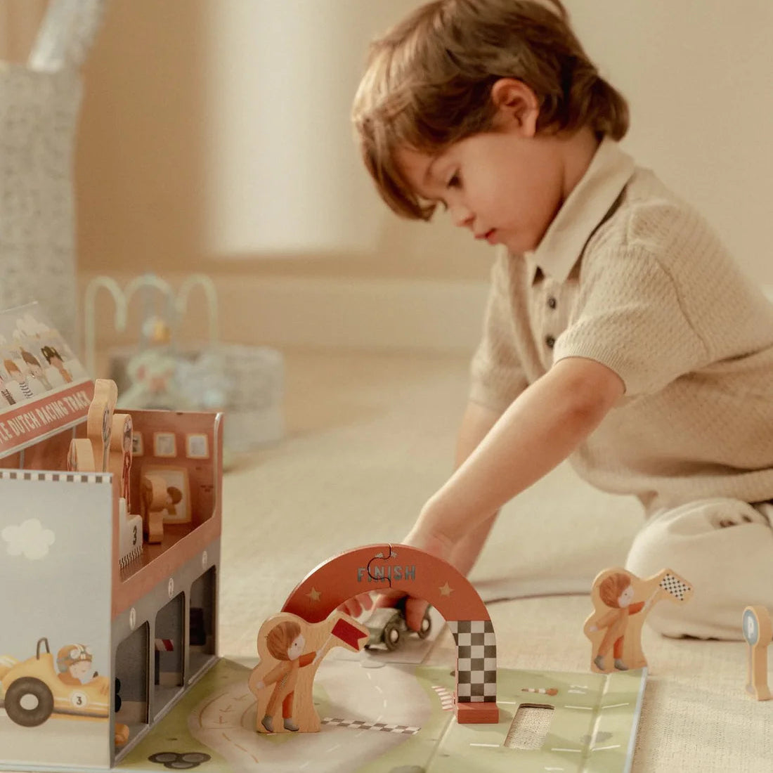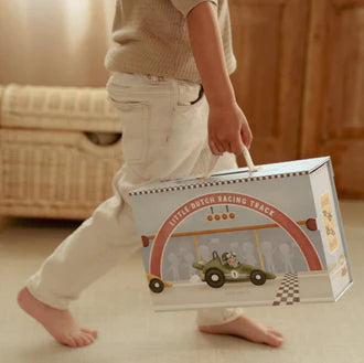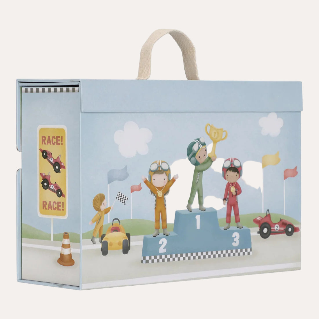Start your engines! This cardboard play case unfolds into a full racetrack complete with race cars, drivers, a finish line, traffic signs, a trophy, and a winners' podium. The track is made of puzzle-like pieces that are easy to assemble. When the race is over, pack everything back into the case for tidy storage. Ready, set, race!