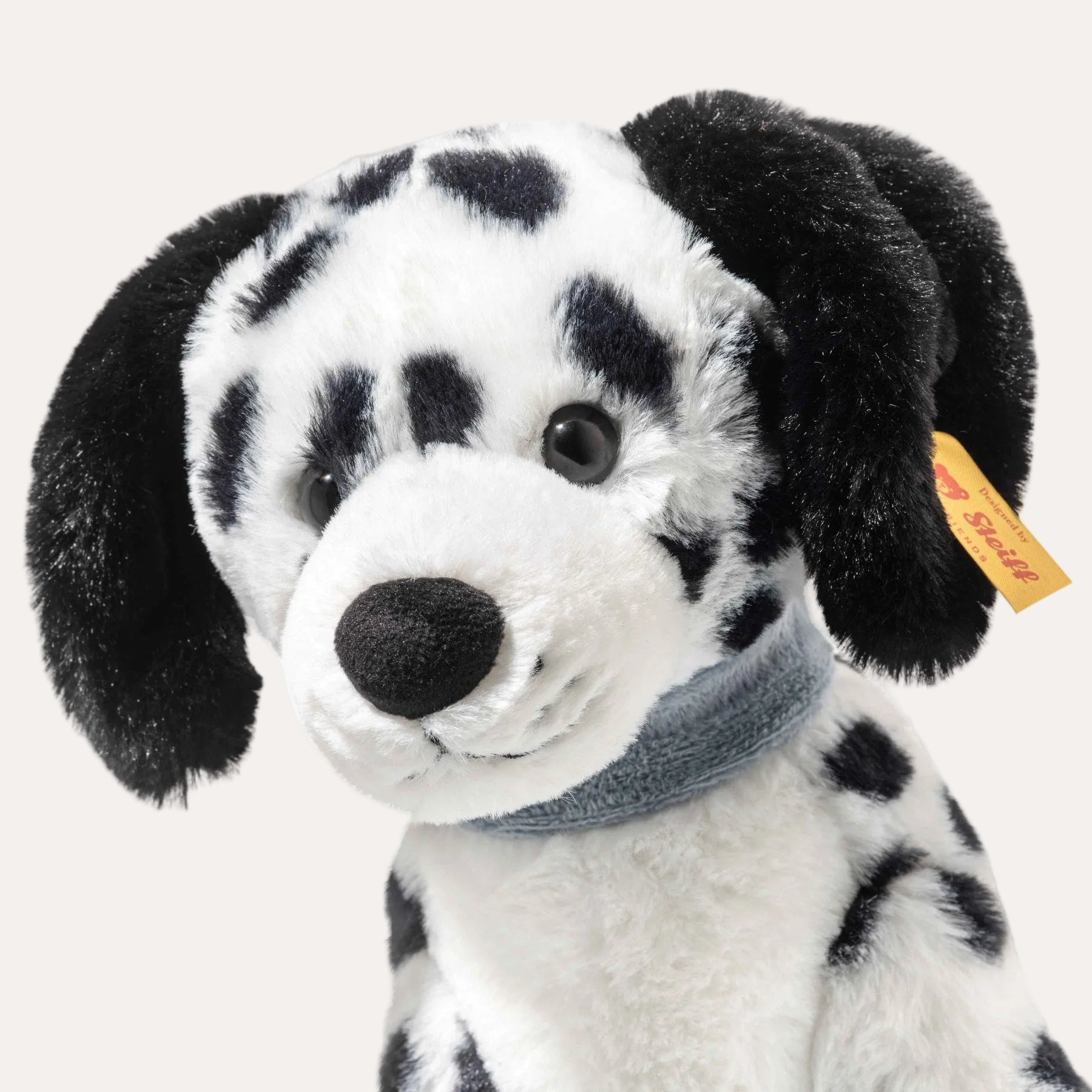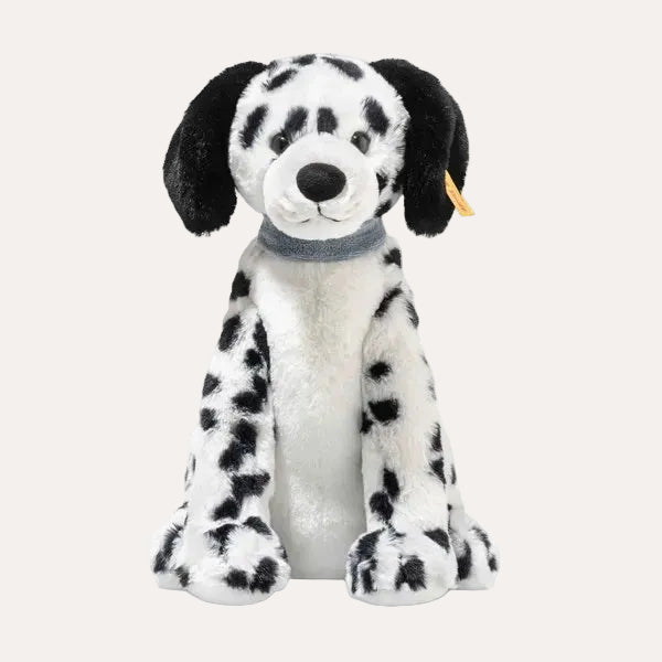 Full marks for this dog: The sitting Dalmatian Oskar is 27 cm tall and made of cuddly plush. With the typical black dots on bright white, this spotty friend is a true stand out. The blue Soft boa collar provides a pretty contrast to the black and white fur, and its friendly look invites you to play and cuddle. The weight bags filled with granules in the legs, feet and body ensure that the faithful four-legged friend is particularly stable. This makes him the ideal guard for the children’s room and a lovable family dog.