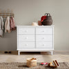 With its timeless and classic design, the Seaside dresser with 6 drawers is the perfect addition to any children's room or interior space requiring storage solutions. The six spacious drawers offer ample room for everything from diapers and clothing to books and toys, allowing you to keep all of your child's essentials neatly organized in one place. Thanks to its generous dimensions, this dresser provides plenty of storage space while maintaining a sleek and uncluttered appearance. The drawers glide effortlessly on high-quality rails, and a special soft-close function ensures quiet and gentle closing. The dresser's rounded edges and porcelain drawer pulls add a touch of nostalgia and sophistication, enhancing its overall charm. With its visually light expression, the Seaside dresser seamlessly blends with any interior decor, whether traditional or modern, elegant or understated. Additionally, the dresser can be customized with two pull-outs integrated on each side underneath the top plate. One pull-out features small bars for hanging or placing items, while the other serves as a holder for the included laundry bag. For added versatility, you can purchase a Seaside nursery top, allowing the dresser to double as a changing station, providing both storage and functionality in one stylish piece of furniture.