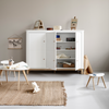 The multi cupboard lives up to its name by offering versatile functionality in a compact design. Its modest depth and height ensure efficient storage without taking up unnecessary space, while the rounded edges give it a visually lightweight appearance. This makes it an ideal choice for children's rooms where space is limited or for organising essentials near the front door or in the kitchen. Equipped with three narrow shelves and three wide shelves, one of which is fixed, the multi cupboard provides ample storage options. Its three doors, divided by a horizontal accent, add a unique touch to its design, reminiscent of folded paper and enhancing its overall balance. Integrated rounded hooks on the sides of the cupboard offer additional hanging space for items like outfits, ballet shoes, or bathrobes. These hooks seamlessly blend with the furniture when not in use, adding both decorative and practical value. The depth of the multi cupboard is optimised to accommodate children's clothes hangers on the hanging rod behind the left door. Meanwhile, the adjustable wide shelves can easily accommodate items of various shapes and sizes, ensuring efficient organisation.