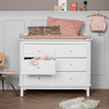 The Wood nursery dresser blends functionality with ample storage space. Its 6 spacious drawers keep nursery essentials close at hand, ensuring you never have to turn your back on your baby. The rounded edges of the nursery plate create a safe and comfortable nursing environment, allowing for movement and play while maintaining intimate contact between parent and baby. With rounded edges on the back face, the Wood nursery dresser stands out visually from the wall. Its 6 solid drawers glide effortlessly on high-quality rails, and a special 'soft close' function prevents pinching of small fingers. Integrated rounded hooks on the dresser's sides provide convenient storage for decorative objects or essentials. Available with plates in two sizes, covering either half or the entire surface of the dresser, the Wood nursery dresser accommodates changing needs. The smaller nursery plate holds a single changing cushion, while the larger one fits two. Discreet edges on both plates ensure visual harmony when combined with the dresser. When the nursery plates are no longer needed, they can be easily removed, transforming the dresser into a timeless piece of furniture.