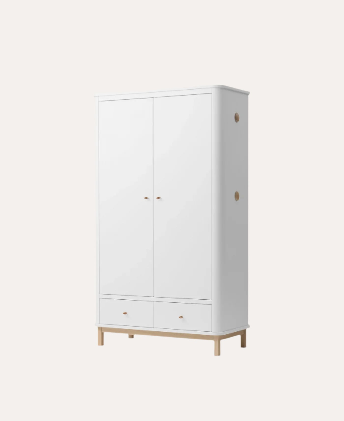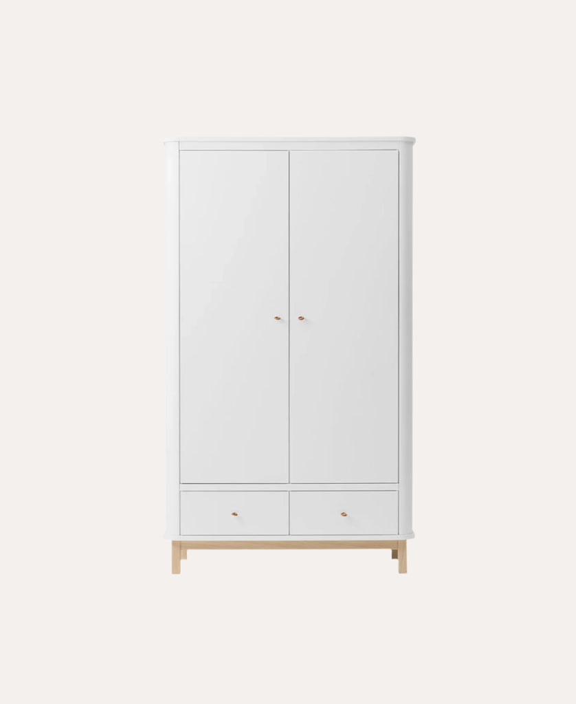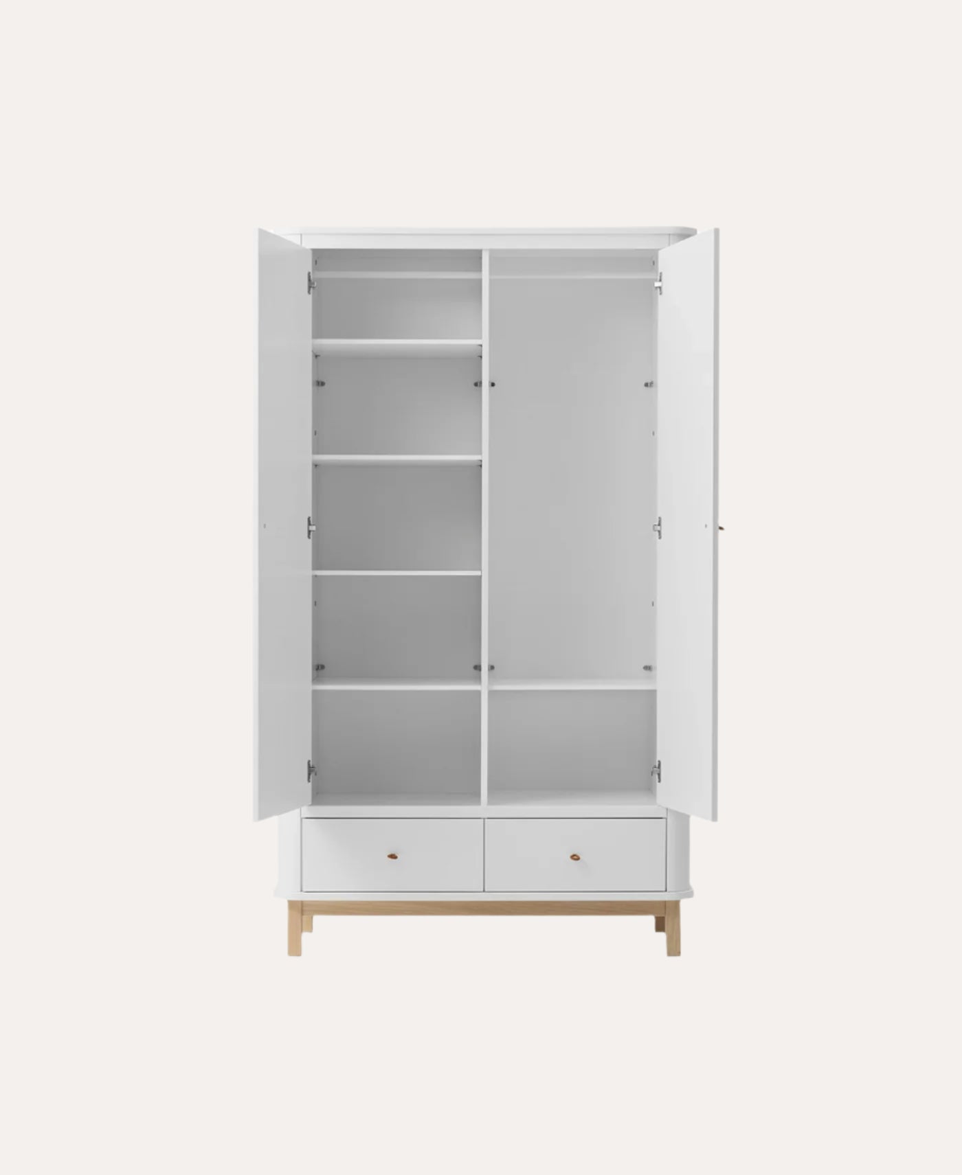 The Wood wardrobes are made of MDF, which is engineered wood consisting of 60% birch, 20% pine and 20% aspen wood. MDF is very strong and durable. The wardrobes are offered in two different models: one with legs and hooks in beautiful white-oiled oak and one in all-white with legs and hooks in birch.