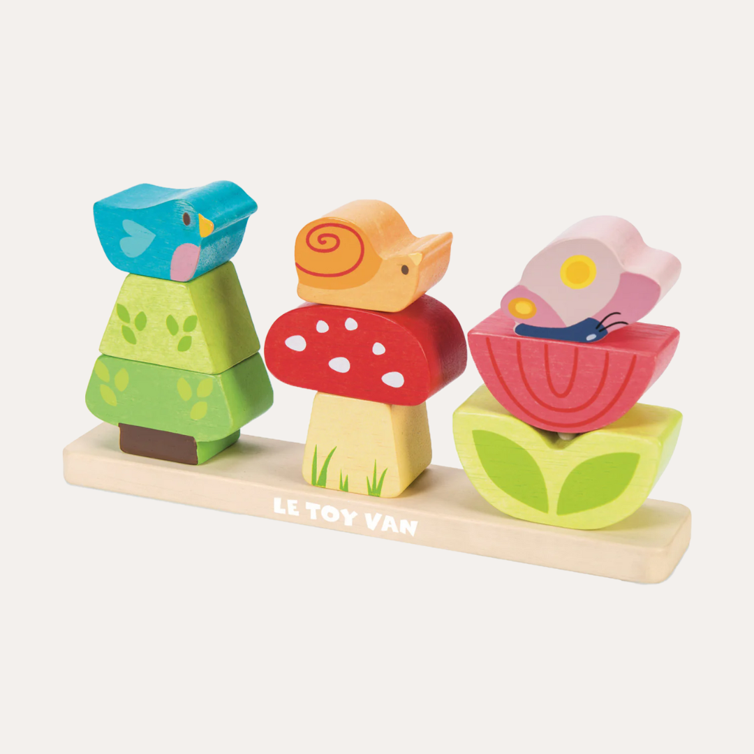 Build the toadstool, tree and flower and top with a little garden friend. Crafted from sustainable wood, this toy encourages manual dexterity and hand eye co-ordination. Painted in lovely vibrant colours using natural, water based stain.