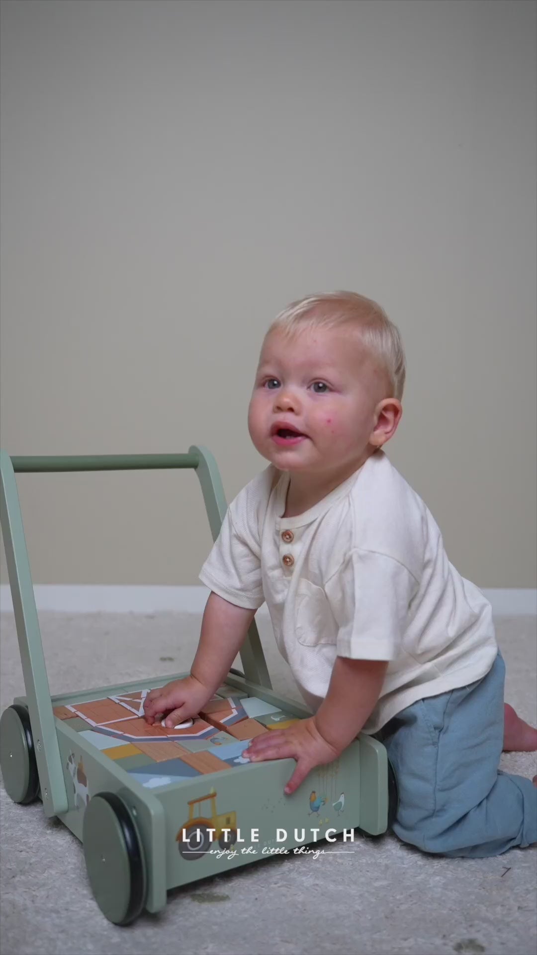 Designed as a 2-in-1 activity walker and building block trolley, this sturdy push-along toy helps toddlers develop balance, coordination and confidence while learning to walk. The included wooden blocks, illustrated with charming farm scenes, encourage imaginative stacking and shape recognition.