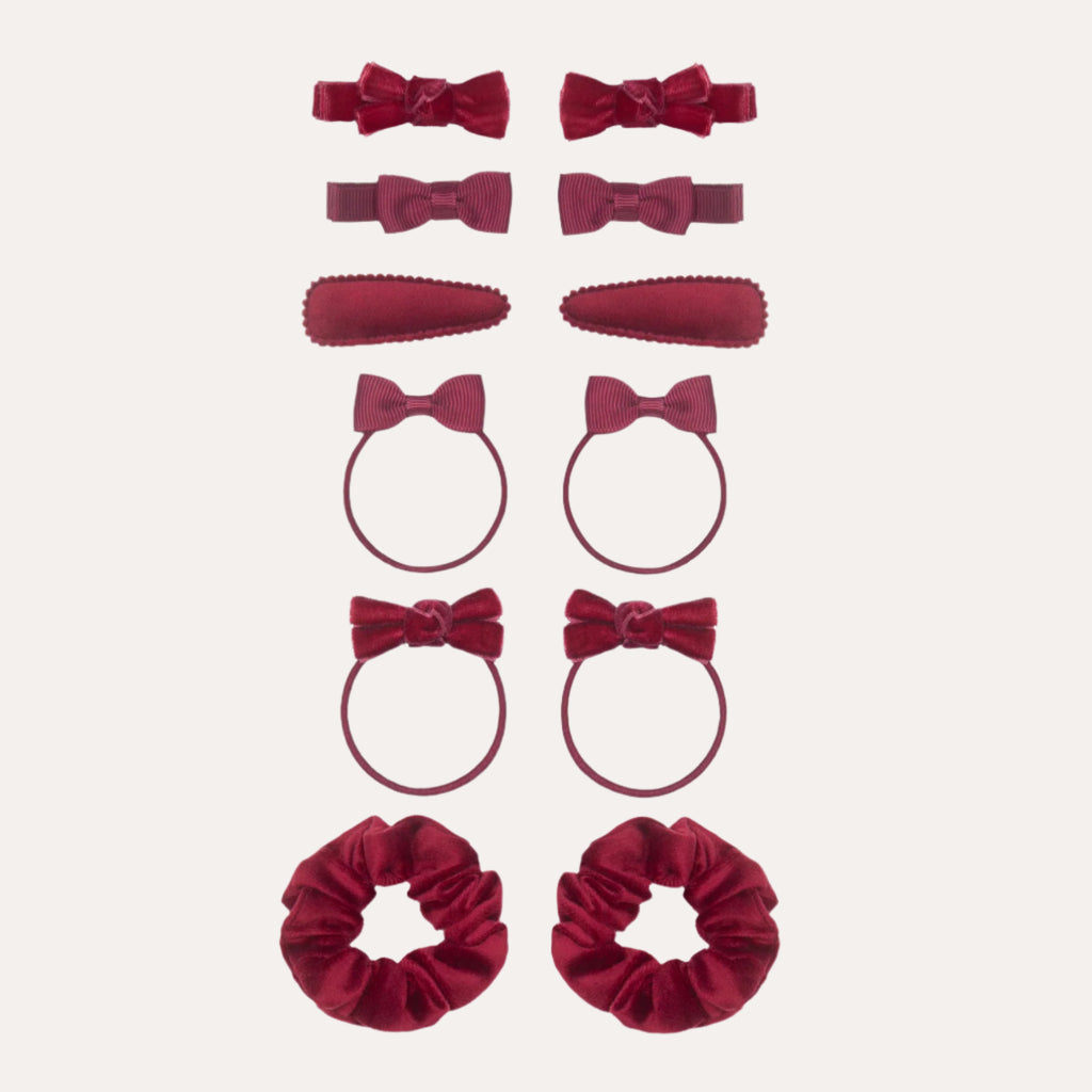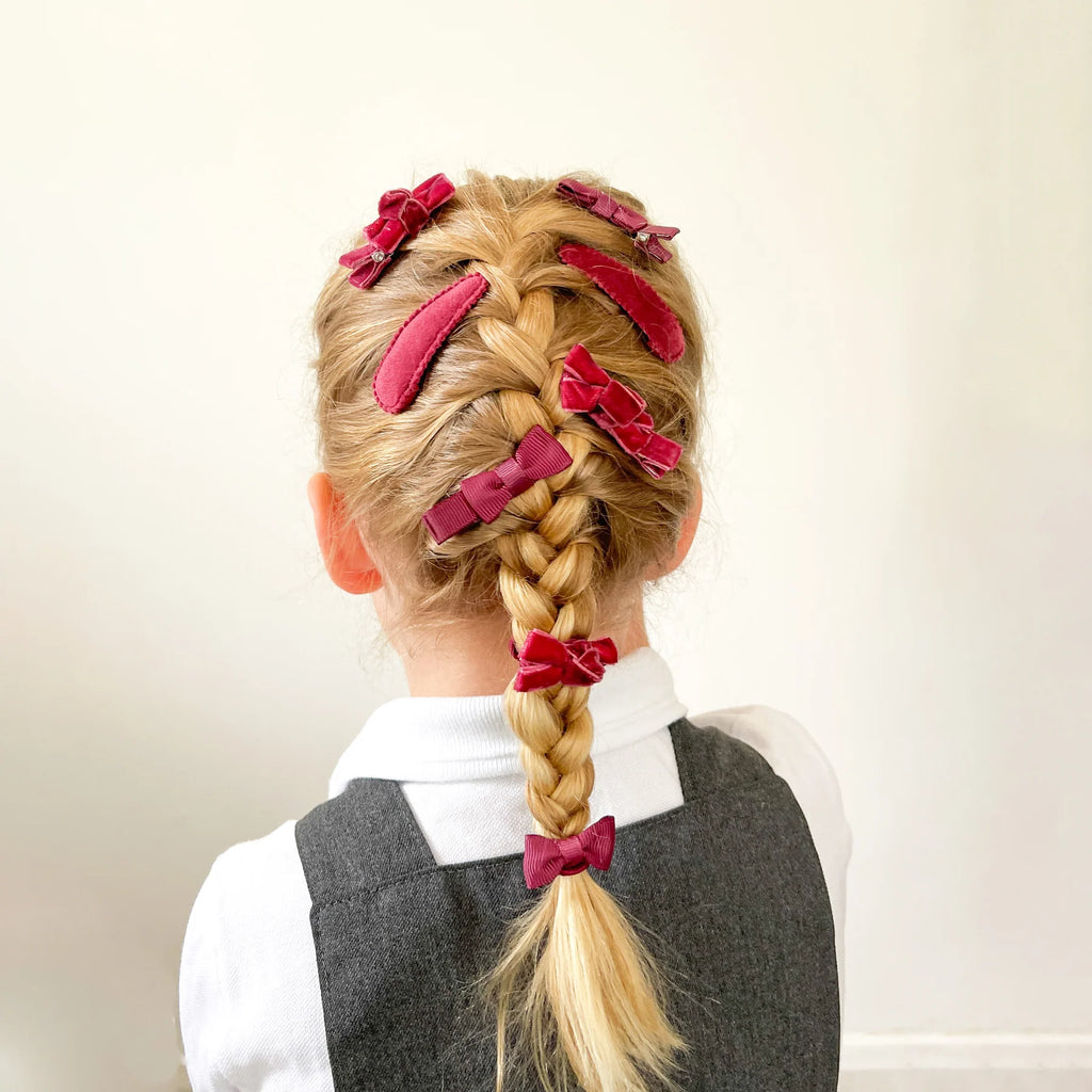 Get ready for school days with this playful assortment of 12 hair accessories in navy! From hand-tied velvet bow clips and matching ponies to grosgrain bows, velvet clic clacs, and soft mini scrunchies, this pack has everything to style plaits, ponies, and more. Perfect for adding a fun, coordinated touch to any school outfit. Please note, not suitable for children under 36 months.