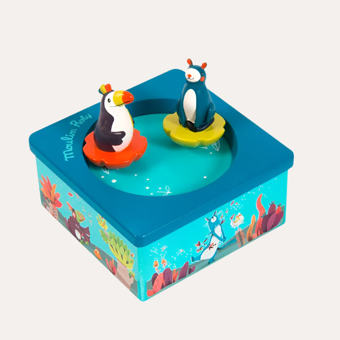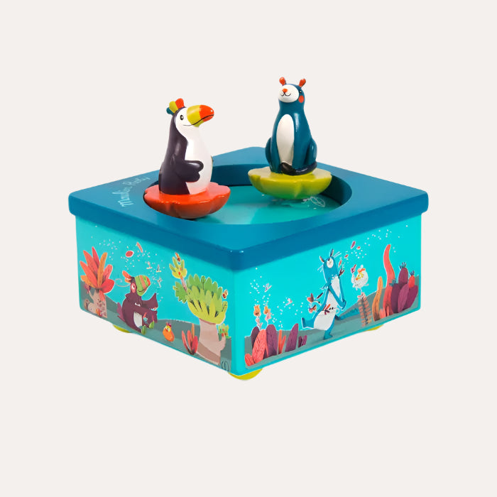 Introduce your little one to the magic of music with the In the Jungle Music Box! Adorned with a vibrant jungle landscape and singing characters, Pakou the toucan and Zimba the panther, this box will rock and dance to lull your baby to sleep. A cheerful and musical addition to any nursery!