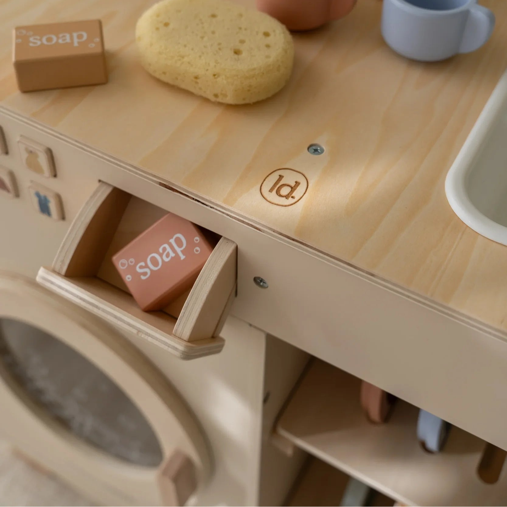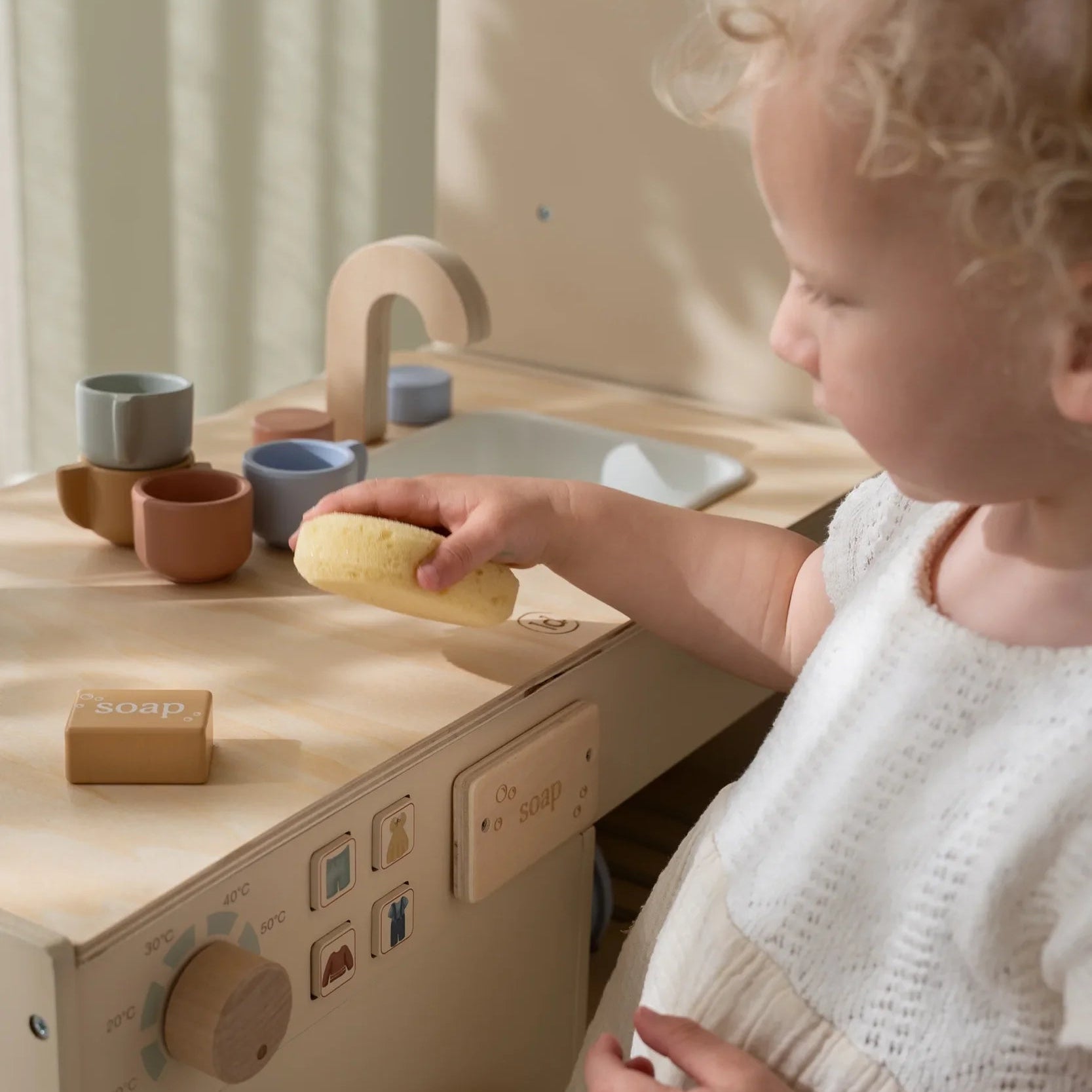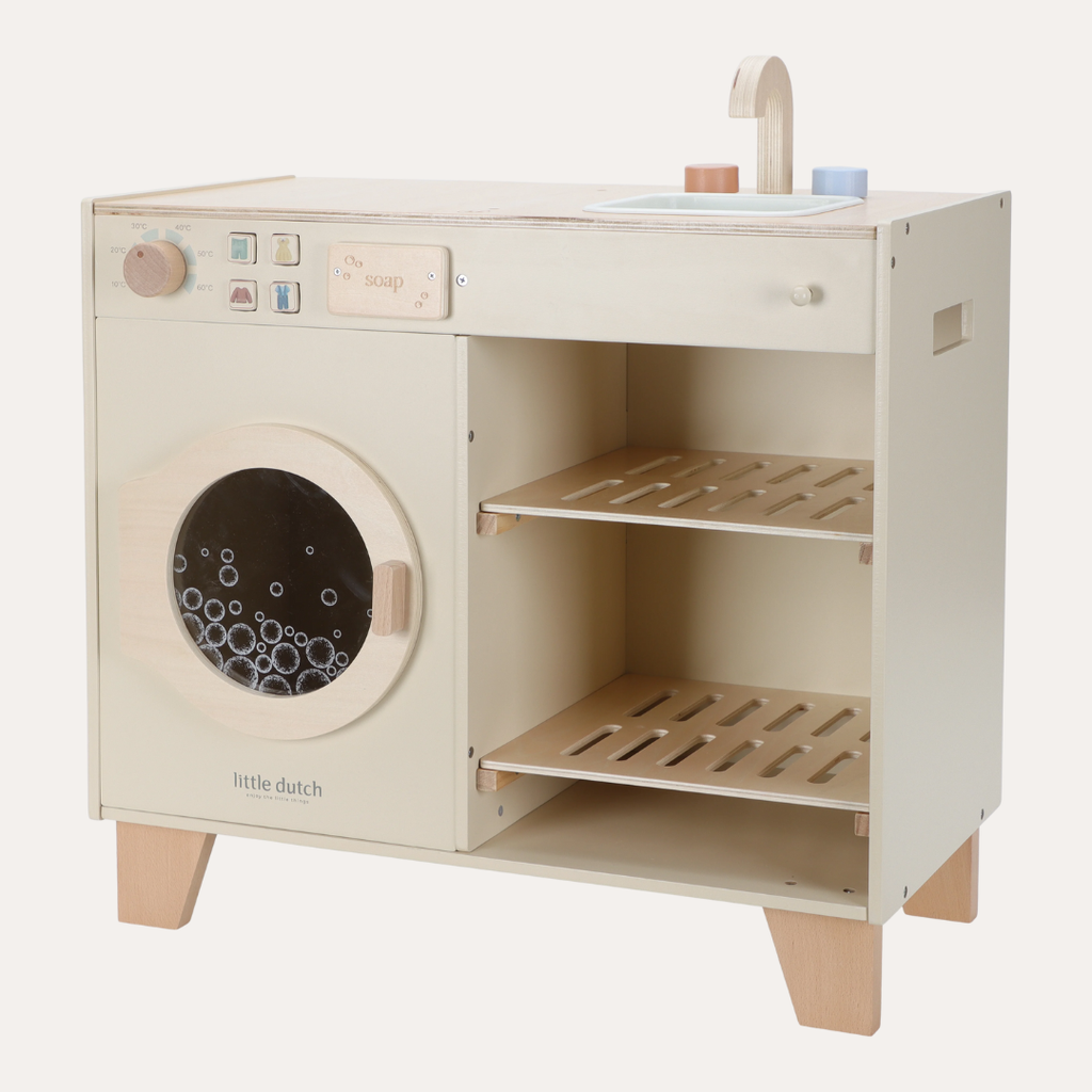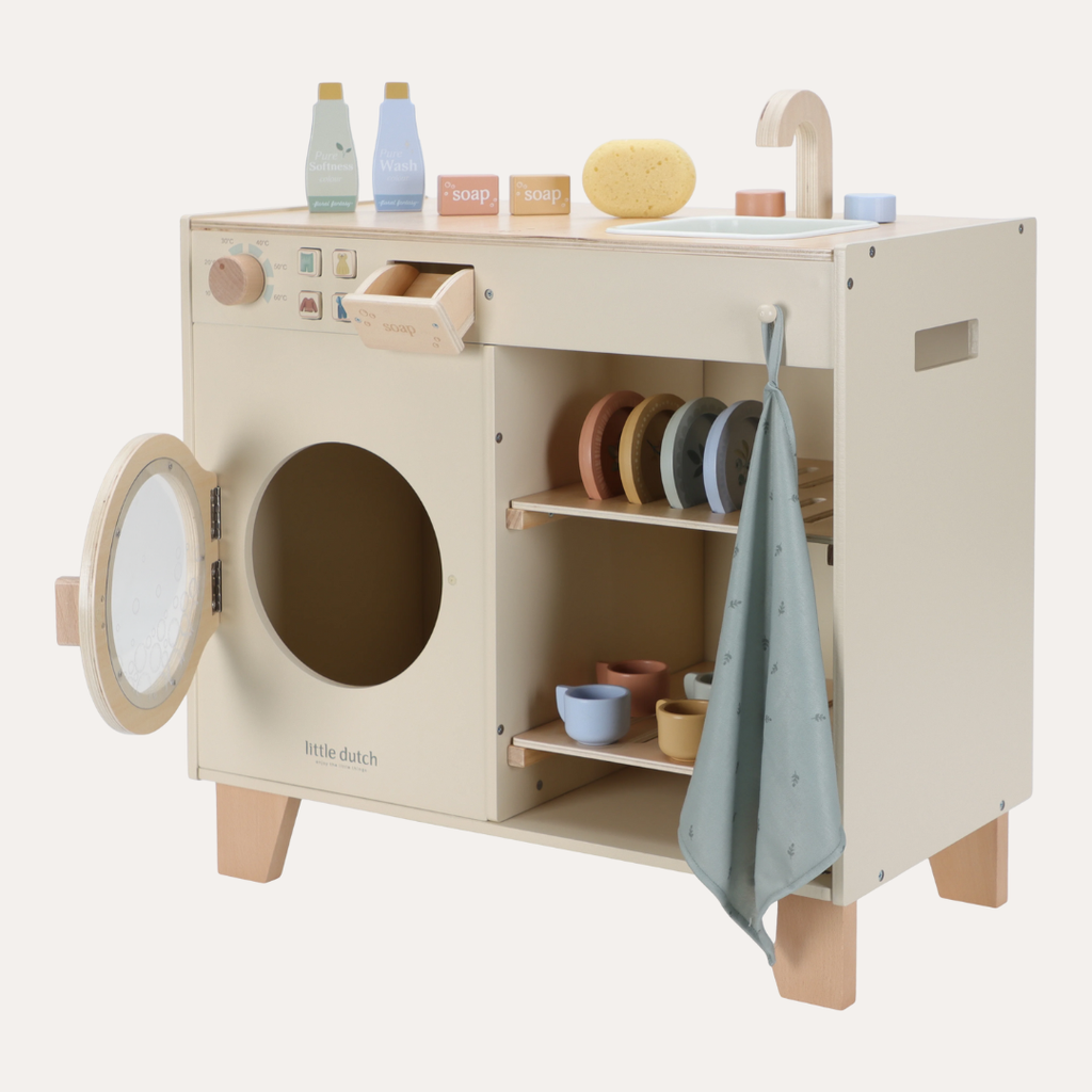 When mealtime’s over, it’s time for a tidy-up with the Washing Machine & Dishwasher Set. Featuring cups, saucers, plates, and playful soap accessories, little ones can wash up, fold, and keep their kitchen spotless — all while learning through role play.