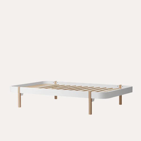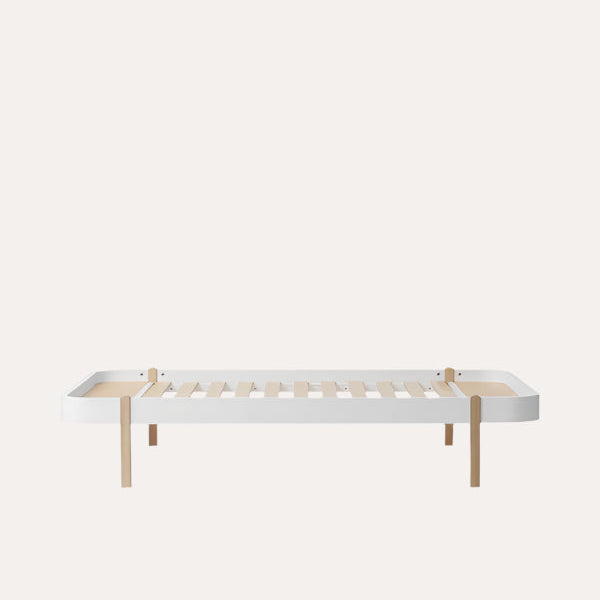 The Wood Lounger bed lives up to its name, providing both comfort and style as a versatile daybed. Its simple yet timeless design makes it a perfect fit for children's or teenagers' rooms as well as living spaces. Whether in its classic or extended version, the Lounger bed exudes a quiet elegance that effortlessly complements various furniture styles, allowing for diverse visual expressions. Crafted with meticulous attention to detail, the Wood Lounger bed features a white lacquered frame that can be paired with legs in white or white oiled oak. Rounded corners and nearly invisible joints contribute to its visual lightness and chic appearance. With standard dimensions of 90 x 200 cm, the Lounger bed is ideal for smaller children's rooms, while the 120 cm wide extended version offers more legroom, catering to the needs of tweens and teenagers, and accommodating sleepovers with friends. Its generous space easily transforms into a cozy hangout, providing a personal sanctuary for sharing secrets and fostering creativity.