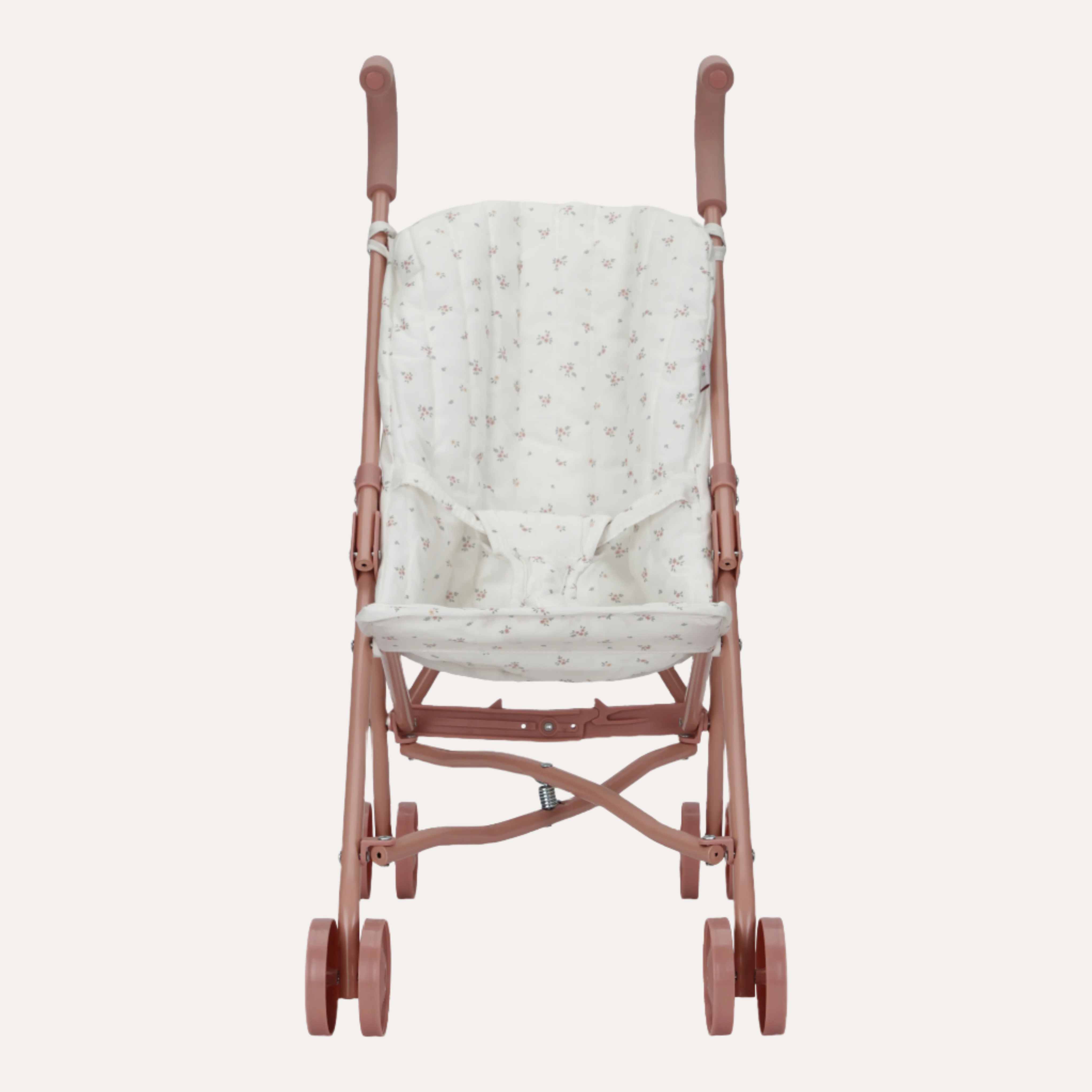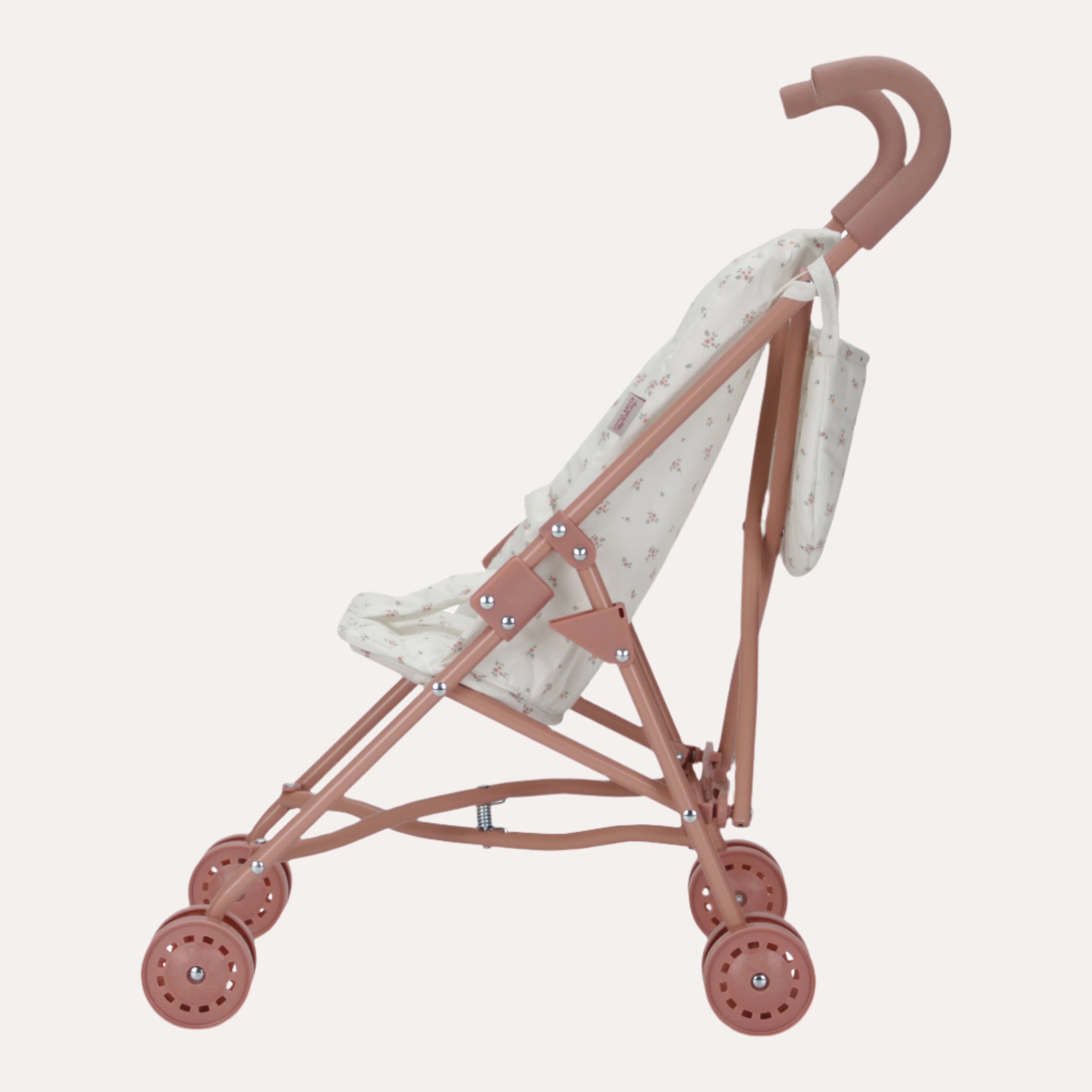 Embark on a new journey of imagination with this elegant metal doll stroller, perfect for your favourite Little Dutch baby doll or cuddly toy. Featuring the charming White Meadows pattern on the seat and a coordinating storage bag on the handles for doll accessories, it combines style with practicality. A secure strap ensures your doll stays comfortably in place during every stroll. Designed with a pink frame, handles, and wheels, this stroller encourages imaginative play while fostering a sense of care and responsibility. Its convenient foldable design allows for easy storage when not in use.